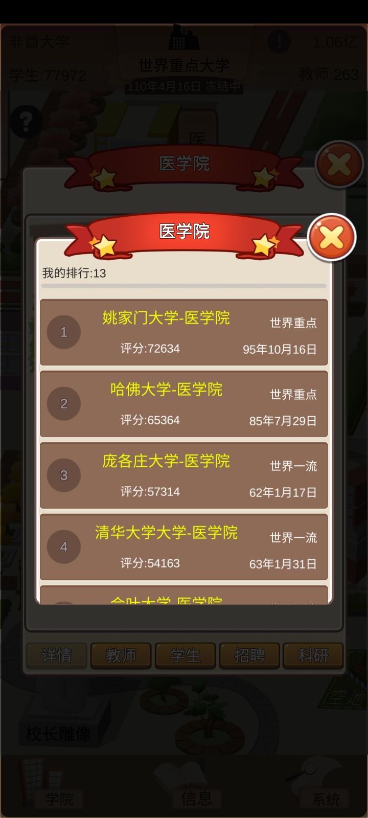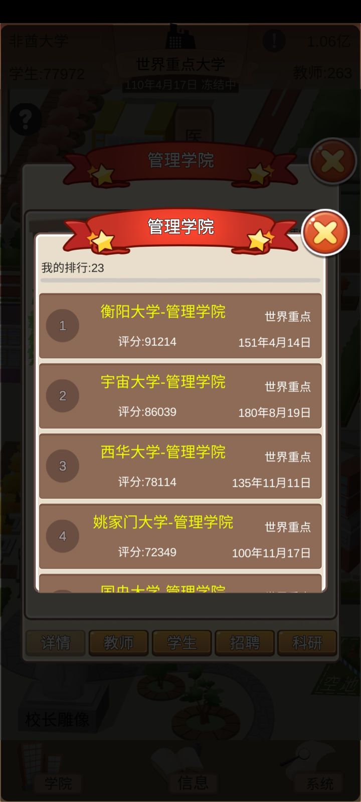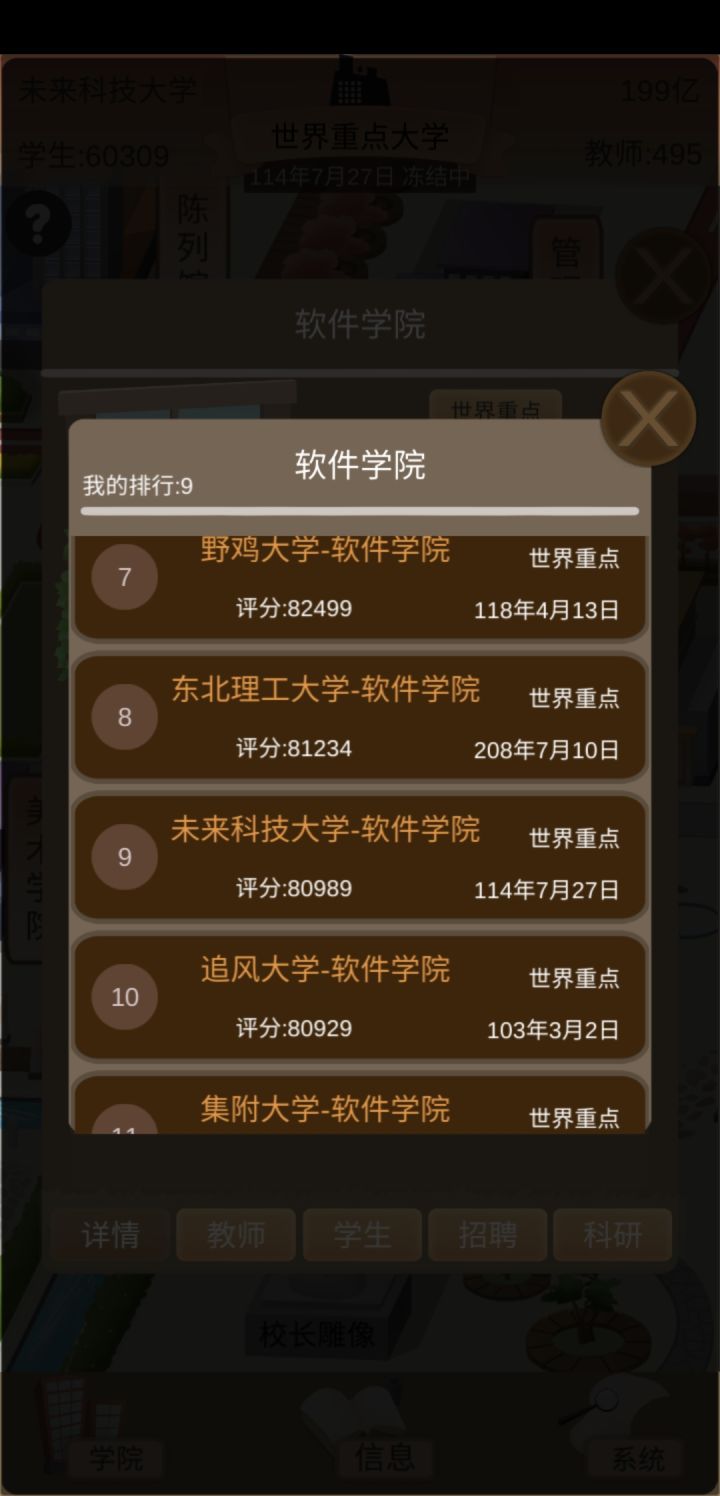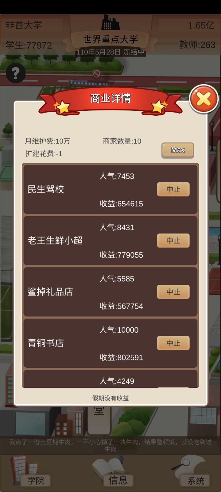 玩了一天的萌新心得:我发现,玩这个,就得心黑,学费拉满,食堂利润拉满,双倍补助,一个学院一个学院的建,全力开发科研去授权,前期几个E级的用来授权,一个月两万多分成,后面的拿来捐赠,涨名望和政府关系;C、D级多少钱记不清了,我现在开发A、B级了(主要是B),一个月几百万上千万分成,加上九级商铺、满级自营食堂和补助,一个月能有几千万。目前才省级一流大学,才建里三个学院,一个是国内重点,一个是国内一流,一个是省级一流,在我没有完全发育起来之前,学校的等级是能卡则卡,毕竟后勤、体育馆什么的,维护挺贵的,这样一年只要看一次广告就好了,基本上每个月都有盈利,发展是慢了一点,但是稳的很。再把奖学金拉满,完全就不会出现学生降级的情况,每年毕业生质量贼高,就业九十以上,升学率二十五以上,工资是平均工资的二倍