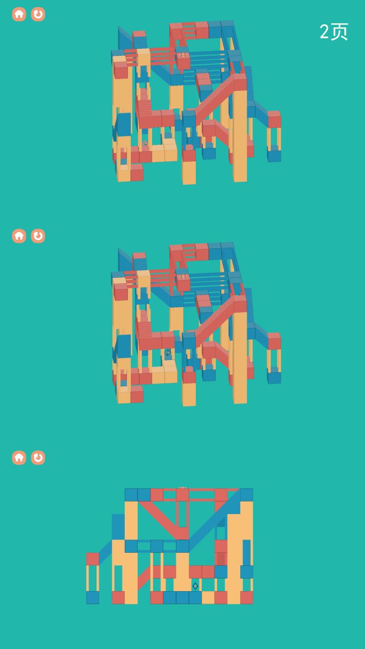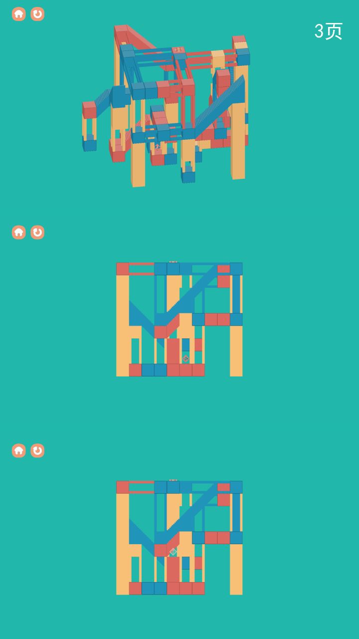 二维模式:只有同色可以走,黄色除外(黄色只能在三维中移动)。同色的判定机制:菱形外框的颜色与地面的接触点颜色相同。二维模式中存在“墙”的概念,特别是后面开始有了柱子的设定之后,会拦住通路。这里有个小技巧是二维模式下请自己脑补只有与自己颜色相同的画面,去掉其他所有的颜色。