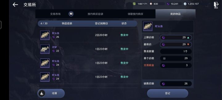 我不知道是我的问题还是游戏的问题,看图,我最低24黑珠的蛇头鱼在交易所是找不到的,交易所最低是25,那么我卖的鱼哪里去了?还有交易所既然最低是25黑珠的鱼,我为什么在摆最低是29?最高也是29?所以这游戏暗箱操作?