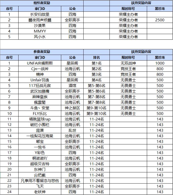 亲爱的冒险家: “自发赛事扶持计划”(详见:)开启征集以来,第一个获得扶持奖励的赛事已完赛,非常感谢冒险家们的积极组织和参与。现针对该赛事的扶持奖励结果进行公示,公示时间为2023/4/6-2023/4/9,如有疑问请联系官方企鹅号3557769208进行反馈。 “自发赛事扶持计划”第一季度征集还在持续进行中,欢迎更多冒险家参与。一、扶持奖励发放名单公示二、比赛赛程公示《黑色沙漠》手游运