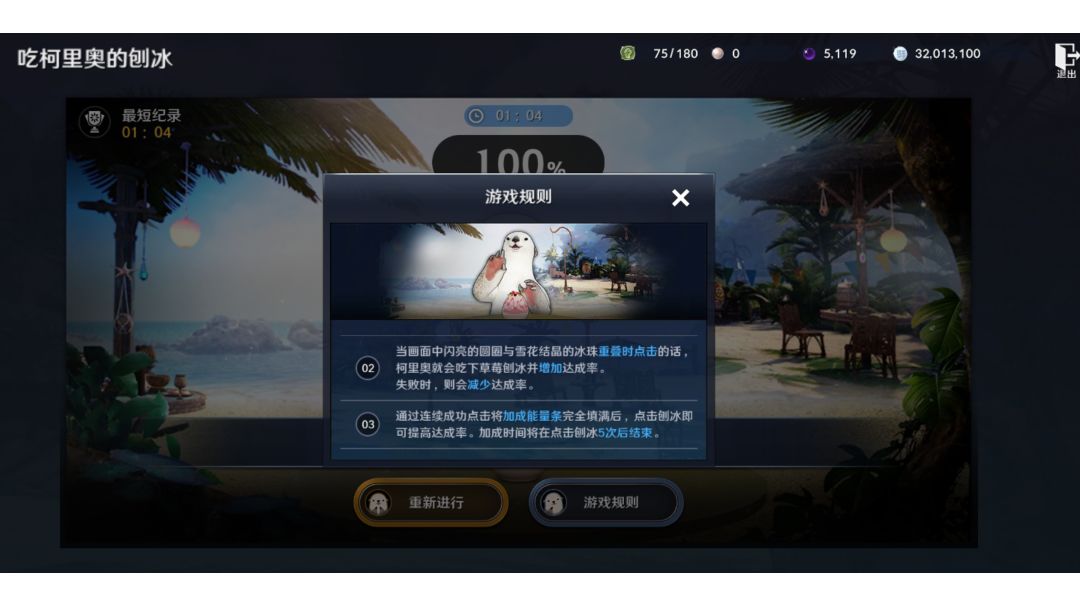 刚进去没看规则,瞎点了下😂。 这里最重要的是后两条规则2.3. 2.当画面中闪亮的圆圈与雪花结晶的冰珠重叠时点击的话, 柯里奥就会吃下草莓创冰并增加达成率。 失败时,则会减少达成率 3.通过连续成功点击将加成能量条完全填满后,点击刨冰即 可提高达成率。加成时间将在点击刨冰5次后结束。