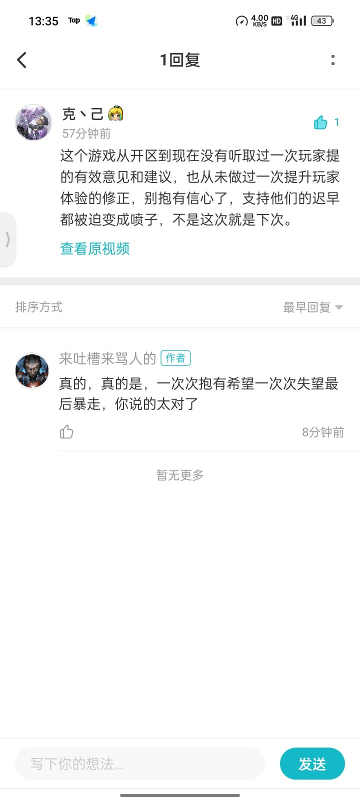 其次我也不应该来说东道西的,老老实实打游戏就行了现在不也挺好的嘛?钓钓鱼,种种地建设一下领地,噩梦挂个机,想开箱子就麻烦一点,赫墩卡尔佩恩首都以外地图没掉落就在首都也挺好啊不用跑图直接开始干活,现在又出了这么多白嫖的活动送门票那么多,转算成黑猪一天也送不少呢,新出的赫墩boss打不死那跟游戏策划有什么关系呢,是我们区人少这是我们自己的问题真的,之前的bug也都给修复给补偿了这不挺好的嘛,我们也不用去新区煎熬,挂个机被杀56十次,也没有人成天在世界发广告也没有骂人的,雷蒙斯战场9000分就可以第一了,不像别的区要打34000分,是我不知满足不懂得感恩。