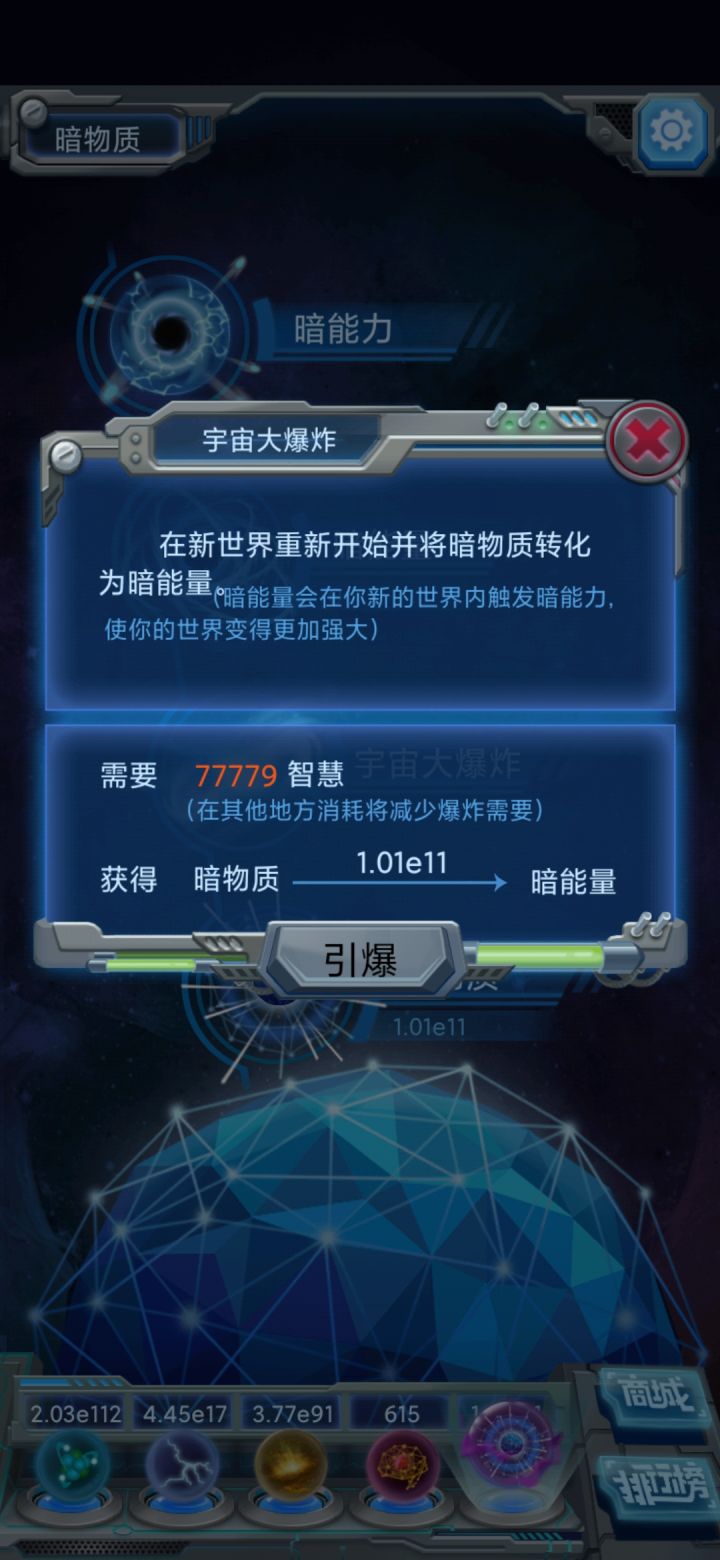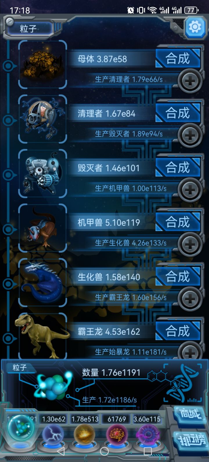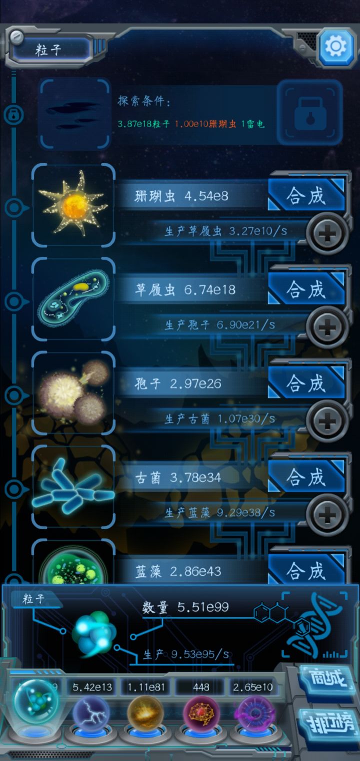 【经大佬MOBS指教,错误太多懒得改了,本帖不删留着自我警醒】大前期直觉上还是挺漫长的,又无聊又好玩。发帖的基本上都是一炸以上的玩家,但其实大家都是从零炸过来的,而且也有很多零炸的玩家一起在玩,所以不着急。提几个踩过的坑:1.不要盲目合成最高级粒子及尘埃生产单位,会断代的;2.不要把智慧过早用去科技,智慧是很珍贵的东西,大脑等级不用很高,神经1000即可,尽快升级思维;3.虚心去看各位大