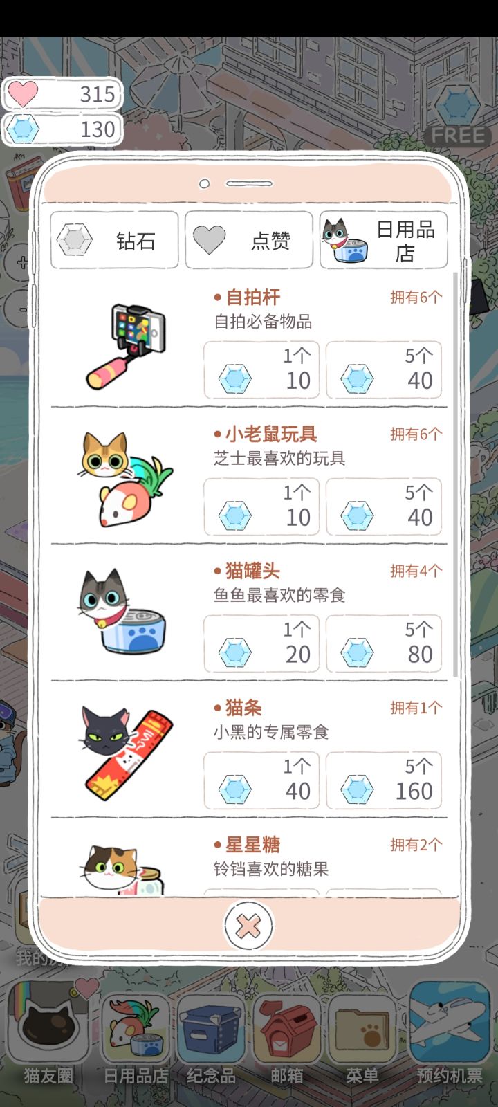 接受喵咪朋友的邀请需要的钻石可以适当减少,也可以相应的出活动来收集钻石。钻石需求量比点赞数需求大,可不可以有相应兑换机制和获取渠道。挺好玩的,整体架构也差不多了,感觉部分问题需要细化,钻石获取渠道过于单一,但钻石需求量大,没有对应购买版块,可能是还没有进入收费环节。