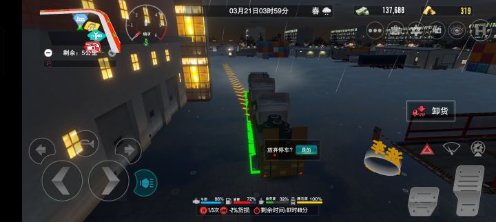 十渡景区到首都机场,全程140公里,算是目前已开通的北京地图里距离最长的一条运输线了,没有抢到内测资格的可以看看,了解一下游戏的情况,途中我有几处交通违规,望谅解😂 前面是一段山间公路,后面进市区后可以沿途欣赏北京市夜景(中间会路过奥运鸟巢和水立方) 我个人认为这款游戏是目前所有卡车手游里非常好的一款了,游戏内很真实,尤其是在交通法规上,例如红绿灯处压实线,长时间占两个车道等都会有违规提示和罚款。场景渲染也很不错,尤其是夜景和雨天。 当然,我也有一些建议: 1.希望场景能渲染的更真实点,游戏中很多场景还是用的贴图,当然,毕竟是手游嘛,设备限制,所以不强求 2.目前只有自动挡,希望增加手动挡模式 3.游戏里的上货和下货位置一直是那几个地点,如北京西站,大兴机场,首都机场等,这点没问题。但每次在选择运输任务后,车会自动出现在起点上货的位置,就比方说我上一单是从北京西站到十渡景区,车到十渡景区完成任务后接下一单大兴机场到首都机场,然后车就直接跳到大兴机场了,这点不好,我觉得,既然上货点和下货点都是固定位置,可以设计成完成上一单后,可以直接在上一单的终点直接接单,订单都为由上一单终点为发货点发往其他地方,这样就更真实 4.我一直想自由在世界里逛逛,但游戏里只有在接单后才能进入世界,你总不能载着一车货去逛吧,再说任务时间一到,会自动退出世界到主页,所以,希望能添加个自由模式