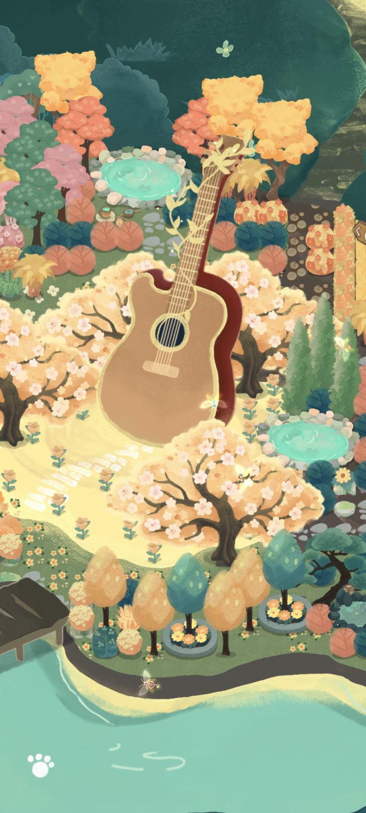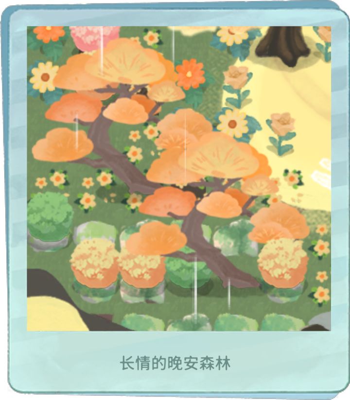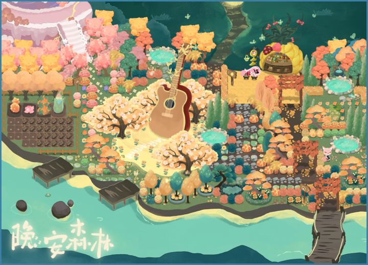 顺便讲下我的思路首先我们得有全图思维,想好整个地图摆放有几个东西是视觉中心,然后再放置几个兴趣点,再思考整体风格和色彩,这次我选用有点古典韵味的园林风格,圆柏和松树用得很多,然后总体以黄绿色为主,梦幻吉他为一个大的视觉中心,小咕咚们的泡澡温泉为装扮的兴趣点,接下来我讲下细节。图一枫叶拱门这样摆放的灵感是来自于日本的“鸟居”,并且枫叶恰好跟秋季地图的枫叶雨相配,能更好的出片,图二,图三就是效果图
