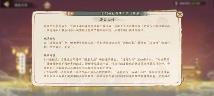 一.逐炎任务:可获得相应奖励。二.拜关肆:可用元宝或者绘玉购买礼包,主要是为了拜炎烈贴用来抽自选天卡卡池。三.烈炎占令:达成相应成就有奖励,可用绘玉购买战令“基金专享”。四.对垒板泉:和绘院里面类似的打伤害副本,按伤害给予奖励,达成成就也有奖励。五.百草沁饮:模拟经营中药房小游戏。#华夏绘世录 #华夏绘世录创作团 #发现好游戏 #游戏攻略