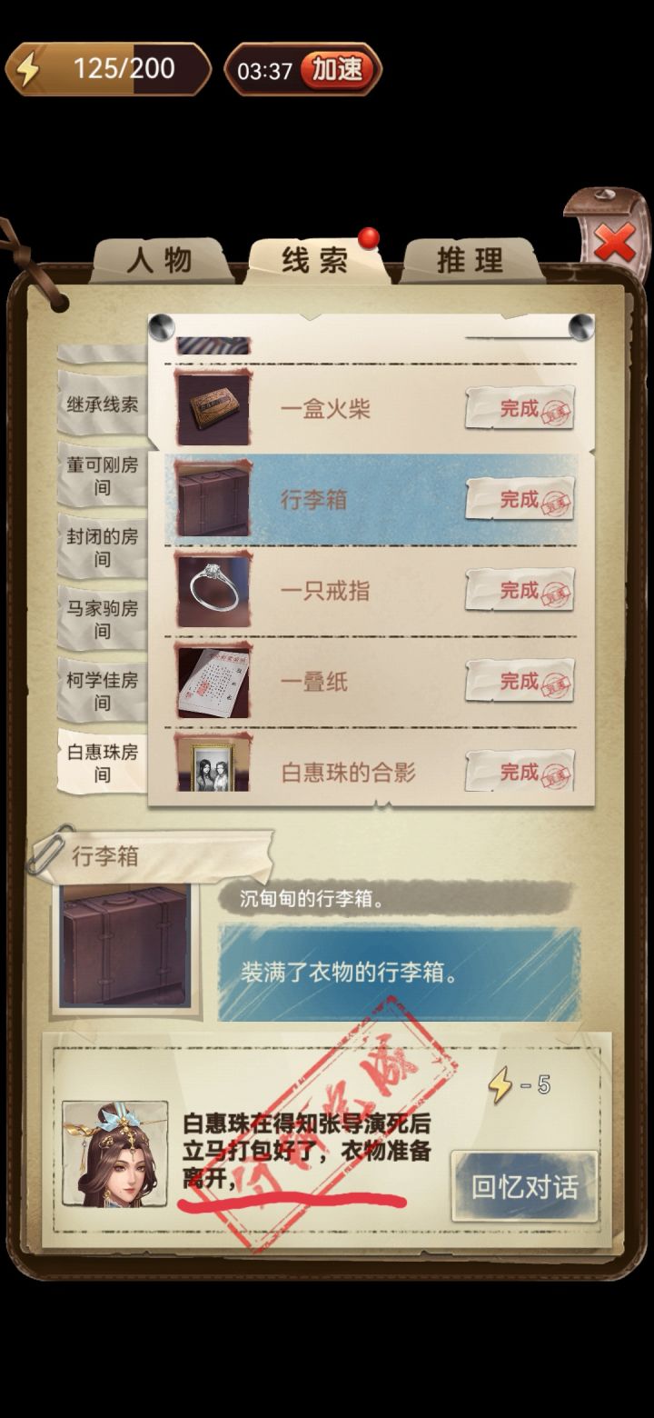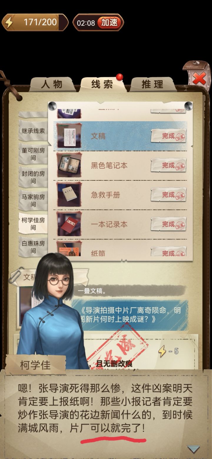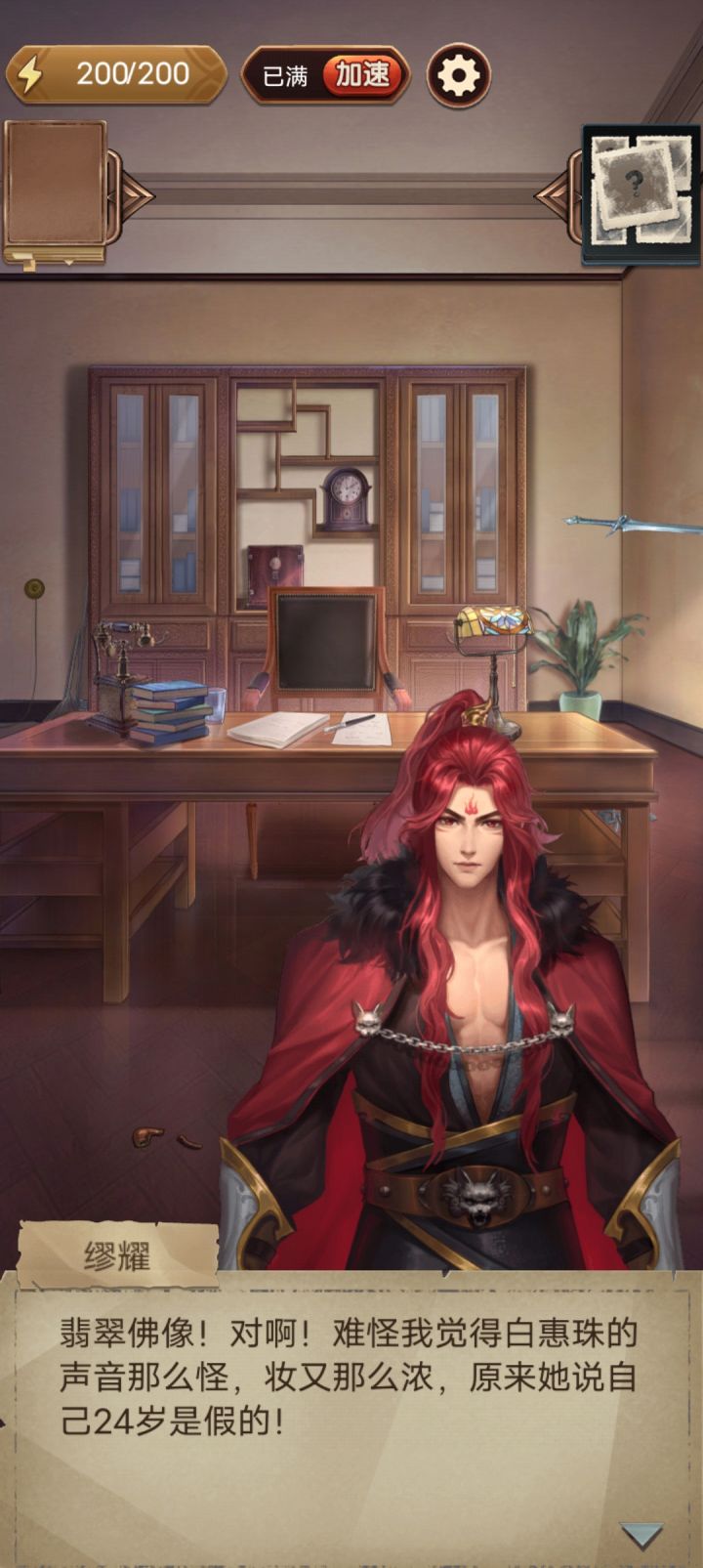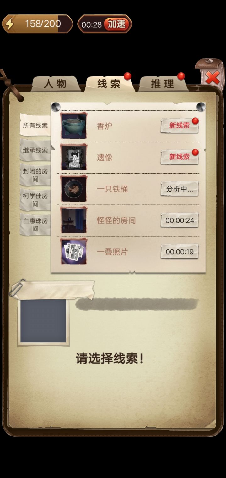 bug出没!!有一个线索不会随着时间流逝分析出来,只能用10个体力快速完成,然后下一个依然一样需要体力,你不管他占了一个分析线索位置,而且也不能推理,你换了它下一个依然一样,浪费体力。我真的哭了😅,不会只有我一个人这样吧不会吧,不会吧……