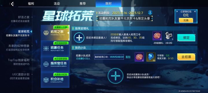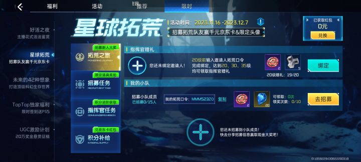 我在《星球:重启》等你,请前往https://act.nvsgames.cn/gms/5faf6b8155?token=MMM56WU7加入我的拓荒小队,输入拓荒口令:MMM56WU7,即刻领取指挥官赠礼、更有千元京东卡大奖等你拿!第一步,点击微端,PC按tab,打开福利第二步,输入邀请码MMM56WU7升级可以获得奖励