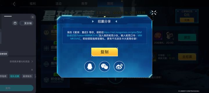 我在《星球:重启》等你,请前往加入我的拓荒小队,输入拓荒口令:MMM5FYYW,即刻领取指挥官赠礼、更有千元京东卡大奖等你拿!光年之恋,加好友冠宇小哥哥,带你探图。福利-限时,然后填写邀请码 MMM5FYYW