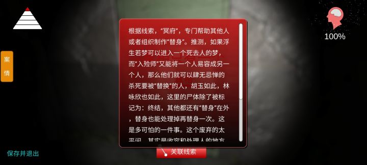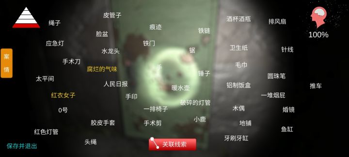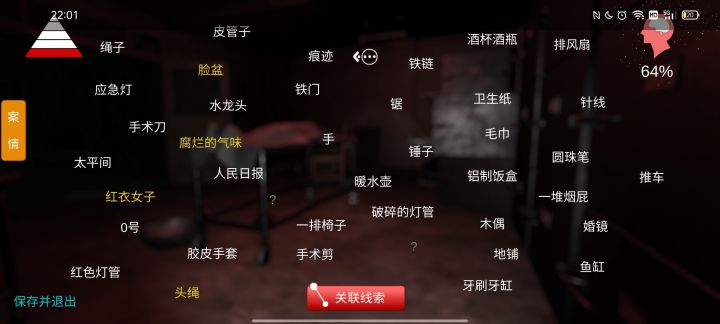 游戏安装包直接在浏览器搜索下载即可,随便下一个,只要手机不提醒你有病毒就可以装。▲▲▲高能预警:1.本部全程高能,走廊的灯约等于没有,开了和没开一样。2.太平间是全部线索的分布地点,其他房间门一律打不开。3.走廊走到头要进太平间的时候有女鬼。———————————————线索关联如下↓1.痕迹+手+推车+手印+0号+太平间→运送2.酒杯酒瓶+手术刀+手术剪+针线+入殓师手册→文泽海