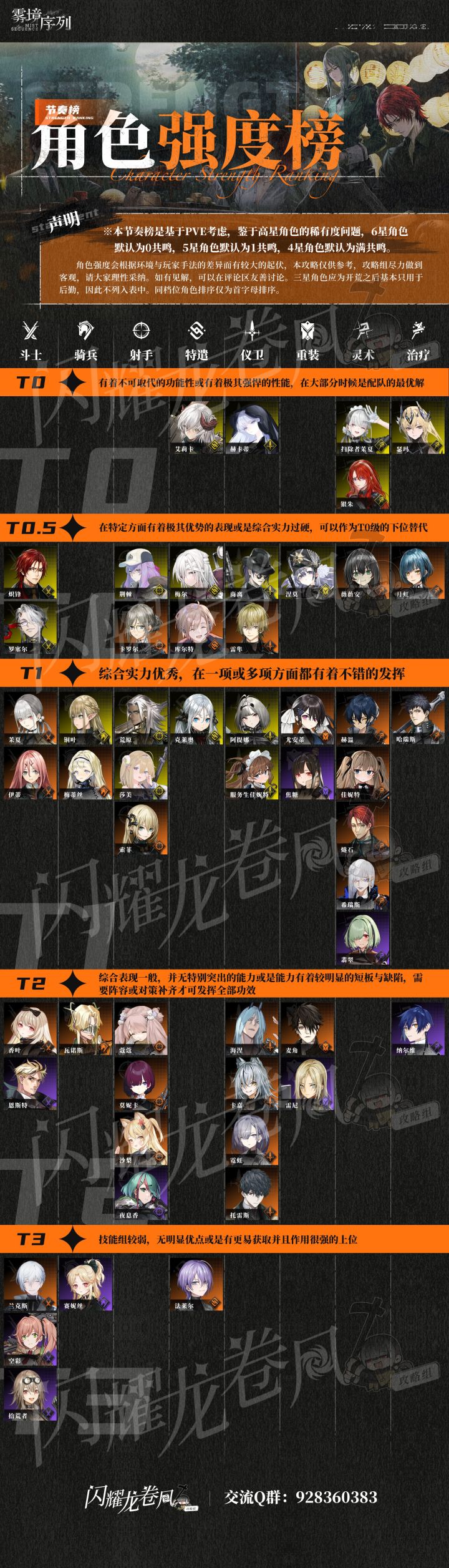 强度榜基于付费测环境和角色技能强度制作。其中特遣和骑兵两个职业需要操作以及合适的地形才能发挥出最大强度。 三星角色因为养成上限低,开荒期结束以后只能在后勤上班,所以并未列入。 (但是个别三星后续会有推荐)欢迎大家加入我们的交流群:928360383