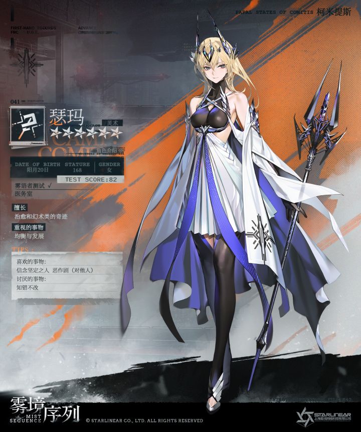 所属:柯米提斯“调查官出去了吗?趁这段时间,准备一点小‘惊喜’吧。首先把办公桌藏起来……啊,把整个办公室藏起来也不错呢。”______________起初,迷雾与灾难如影随形,绝望在动摇的信众间蔓延,有如瘟疫。而以一人之力安抚诸多迷惘之人、为迷途的羔羊予以救赎的,正是身为星颂院高级司祭的瑟玛。与她显赫的地位不同,瑟玛举止温柔、待人体贴,就连偶尔的小玩笑都显得温和又有趣。有传闻说,其实瑟玛早已