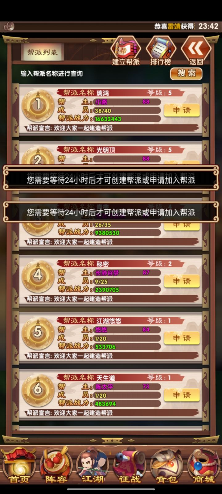 一直进不去帮派,也申请不了,总显示24小时之后再申请,但已经三天了……