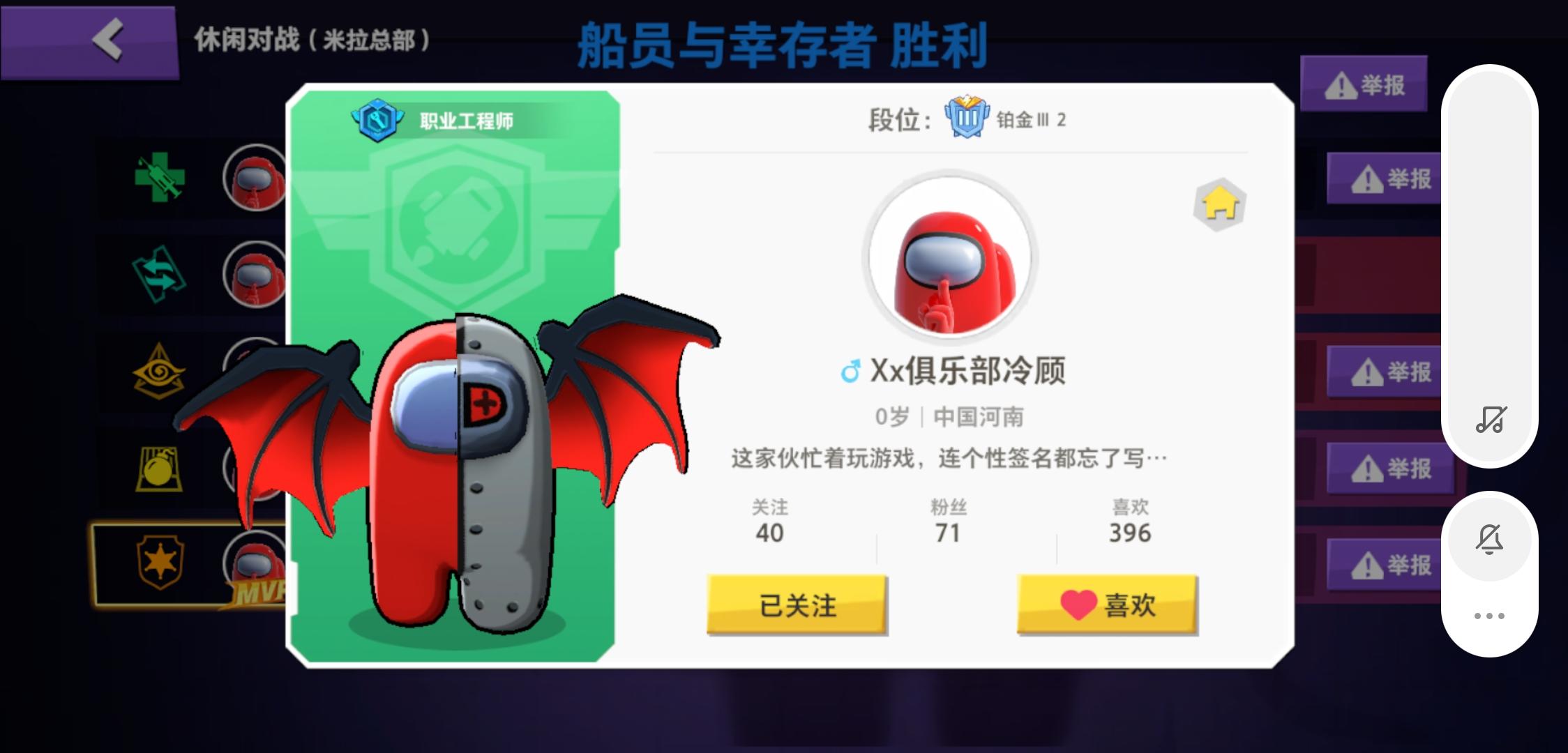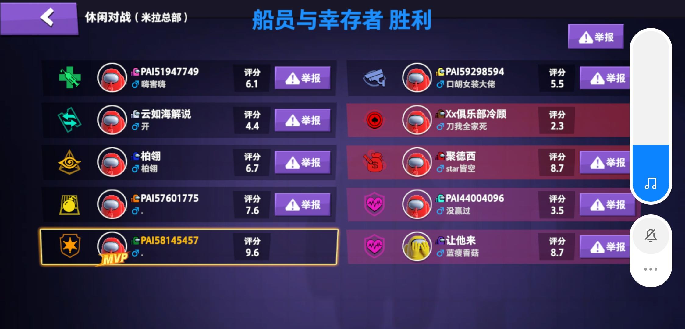 救命,经典模式给我的那个感觉就是十个人里面有六个人都在联机 ,而且联机的理直气壮,当一个内鬼根本不可能赢,到了其中一个人 另一个人立马就说了,我跟他联机的谁谁谁是内鬼,然后排位再给我的感觉就是小学生一直在说一些有的没的,跟那些尸体有关的线索完全不说,然后就瞎猜到底谁是内鬼 ,其实我也算比较喜欢这个游戏吧 我可以大半夜的一直在玩 但是真的,遇到小学生快跑 ,吵的我脑壳疼不说,而且跟线索没有任何关系 就一直在吵吵吵,你知道我一局九个人全是小学生,是什么感受吗,我整个人耳朵都炸掉,还有就是我都说了,我不是内鬼 我可以体检证明我自己,结果还把我投掉,好好的游戏真的要被毁掉 ,还有,我不会再玩躲猫猫了,因为这个bug真的是太恶心了