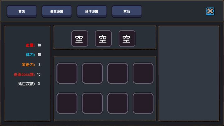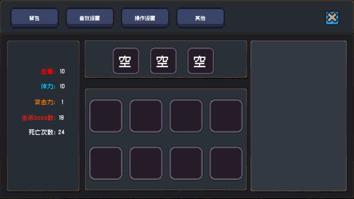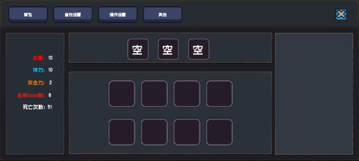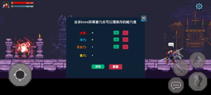 各位玩家老爷,下周将继续增加新的boss挑战,以及修改目前的bug和一些玩家的反馈。针对玩法跟数值的问题:都是以个人感觉去设定的,不专业 见谅!以下是当前游戏中的数值设计:玩家初始值 : 血量10 体力10 攻击力1 金币0翻滚:消耗3体力攻击:消耗1体力空中冲刺:消耗3体力 购买金币1000二段跳:无消耗 购买金币1000贴墙:无消耗 商店无购买第一次击杀boss的掉落物:1