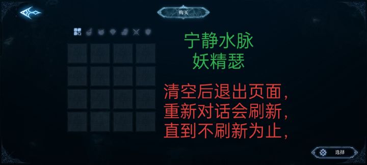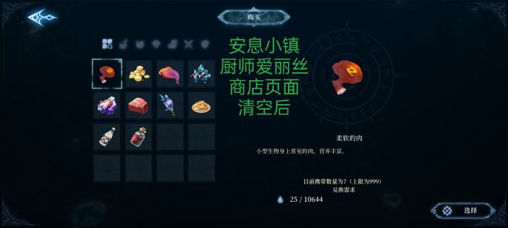 【安息小镇】铁匠 ,陶罐商人,房子里的三个厨师,屋外右边的厨师爱丽丝 她有两个页面,【放逐小镇】古董商斯坦利, 建议完成[旅行]任务以后【宁静水脉】大妖精瑟 【焦痕地】船夫ps: 页面上 物品右下带小数字角标的都要买了