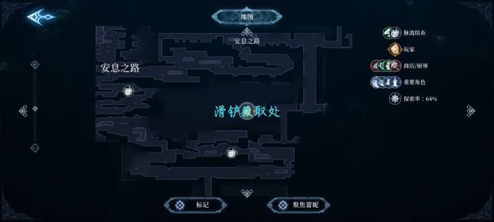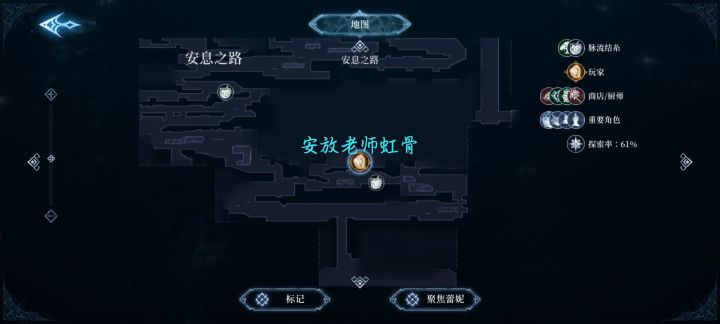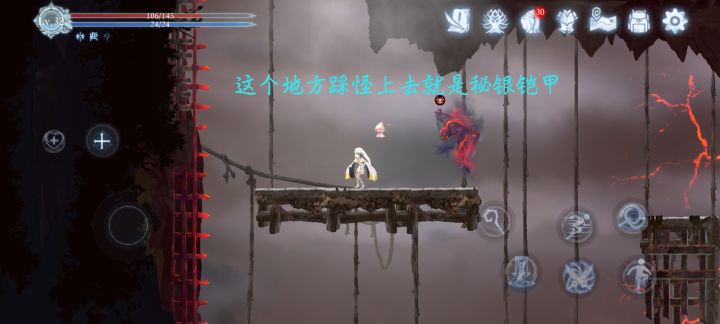4.安息之路(对照攻略图)比较大一点 当然由于前期能力的限制有些地方我们仍然去不了 这里最重要的是拿到滑铲后像能力这里会安葬老师和她的虹骨告别 安息之路这里最重要的就是滑铲 有了这个才能开下一个图 其他的大家自己探索 滑铲在哪 多探探图 然后往右边走是宁静水脉 这里没什么小怪 单从这边走好像过不去 不过对主线来说没啥影响 然后这里需要注意的是 单眼睛固定在那的小飞怪 这个是需要翡翠瀑布BOSS的