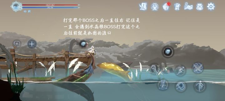 8.灰烬裂谷 额...怪不好打 我们属于超前到达了 这里主要是打这个图右上方的BOSS水晶狼 打完之后就能开启中篇了 关于灰烬裂谷这个时候 好东西拿不到 打完细雨森林回来 可以拿大部分 打完狼BOSS之后 往前面一点 有个渡口 有条鱼在那 发出咻咻咻的声音 此时我们的哨子就是驱动这条鱼的关键 没有哨子 没办法走 卡图 有了哨子之后 鱼可以去三个地方 细雨森林 昔日之森 王城 这里是玩家自己控制鱼到