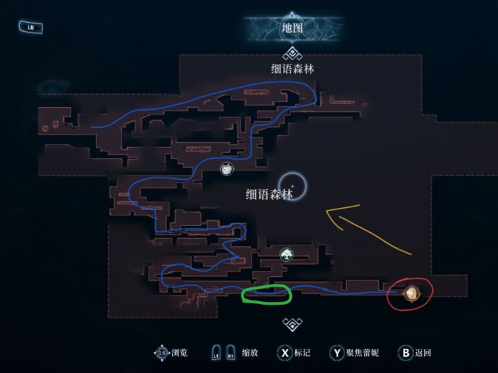如图 蓝色为跑图路线,绿色的小道为必经之路,也是最容易被忽略的地方,红色是该地图重要的技能 攀墙跳 黄色箭头则是有了爬墙以后的探图方向 ,箭头所指方向 为细语森林传送门,能到达 昔日之森前期过不去的右半部分,彻底打消各位小路痴过不去右边的疑问