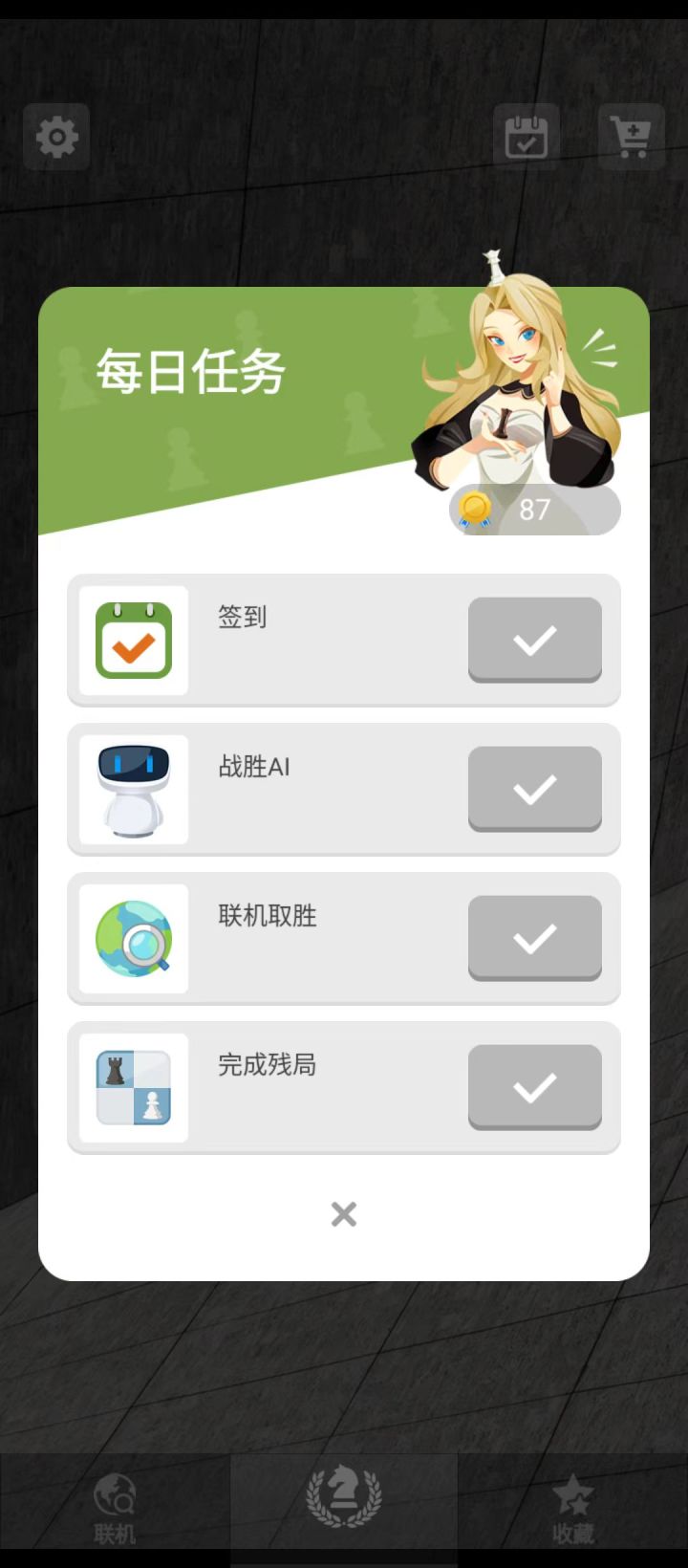 昨天下午14:00下载的,当时就做完了任务1,2,4,后来晚上21:30点把任务3也做了。一直挂着等到了第二天(今天)凌晨3:00点再看,发现任务还没刷新,就退了。今天下午13:30再看,仍然没刷新。#国际象棋
