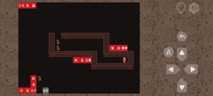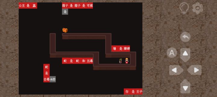 技巧:一直被毒能刷新次数,不会死,开局直接下去把赢推右上角,然后吃左边解药(路上步数太低可以不移动按a让蛇毒一下刷新进度)到第三行第二列,确保第二行第一列无向右蛇,第二三四列无向左蛇,但还要考虑第一行的下一步是否符合以上情况,均符合就能往上回家,否则继续按a等。离开后把"公主"和"是"推到门口,蛇到第一行第二列且第三列无蛇时往下推,从而让蛇推到右边