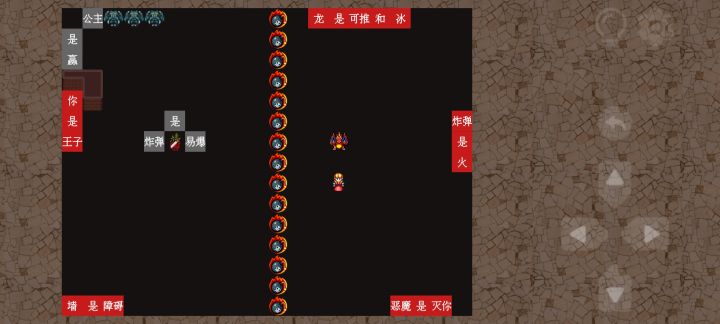 第四十一关操控【王子】拆解“炸弹是易爆”,然后推动“龙是可推和冰”,直至到最左边组成“公主是赢”,触碰【公主】即可过关