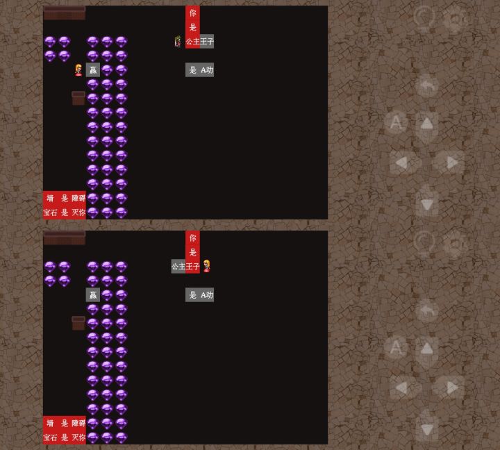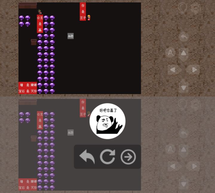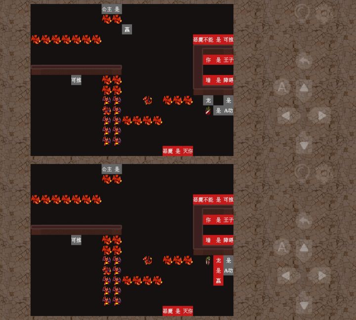 第四十关先把【公主】和文字推至图1.1位置(公主要面朝左)然后操控【王子】向右走一格,组成“公主是A动”。之后操控【王子】一直向左走,直至把“灭你”推至“恶魔是”下面,然后点按钮 A动 ,直至【公主】拆解“恶魔是灭你”。再操控【王子】把“赢”推到“公主是A动”下面,然后一直点击按钮 A动 直至【公主】走到【龙】右边。之后操控【王子】向上走一格,组成“公主是赢”,触碰【公主】即可过关。