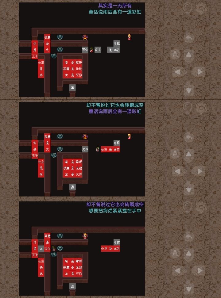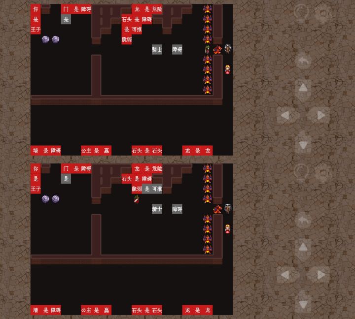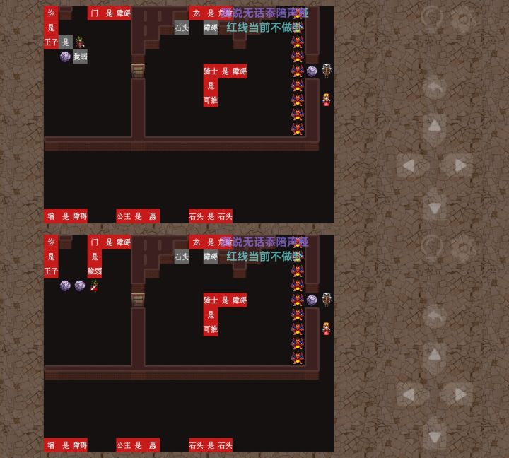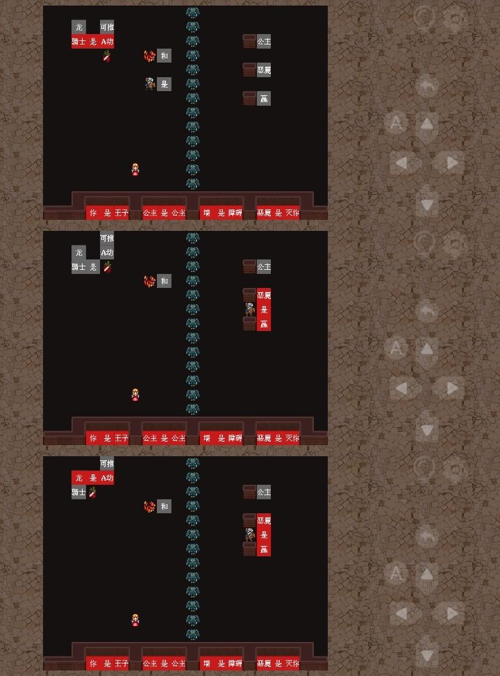 第三十八关先把文字排列成图一所示位置,之后把【龙】推到“和”的左边,并且面向右边。再向上推动“骑士”,组成“骑士是可推”,把【骑士】推到“是”的左边,并且面向右边。然后再向上推动“A动”,组成“骑士是A动”,一直点A,直至“是”还有一格到“恶魔”下面,操控【王子】向上走一格。取消“骑士是A动”。之后再操控【王子】向上推动左边的“是”一格。组成“龙是A动”,一直点A,直至“和”还有一格到“公