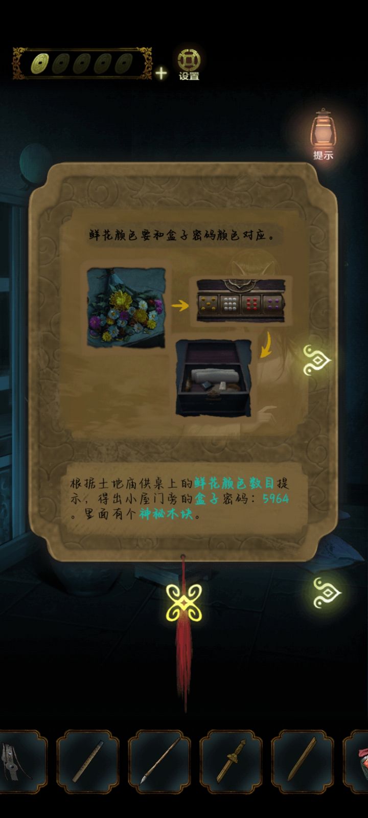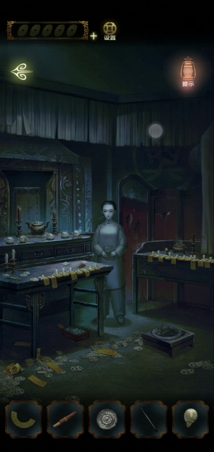 进去。点左边的柜子。点盆景边上的钥匙。连续点右边的花瓶,会掉落如图点⬇️,去院子,进屋子,点钥匙开锁,点剪刀。点↘️出去,点⬅️走廊。用剪刀,帘子边的垂纱。获得如图用纱布擦去走廊右边的两个花瓶,获得如图点如图进去,点如图点如图密码线索,走廊边上的两个花瓶的图案,第一组第二组得出前厅锁的密码开锁后点⬇️,去走廊。看到如图点弹弓,打如图获得饰品荷花。然后去前厅,把饰