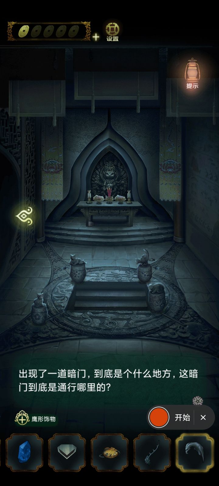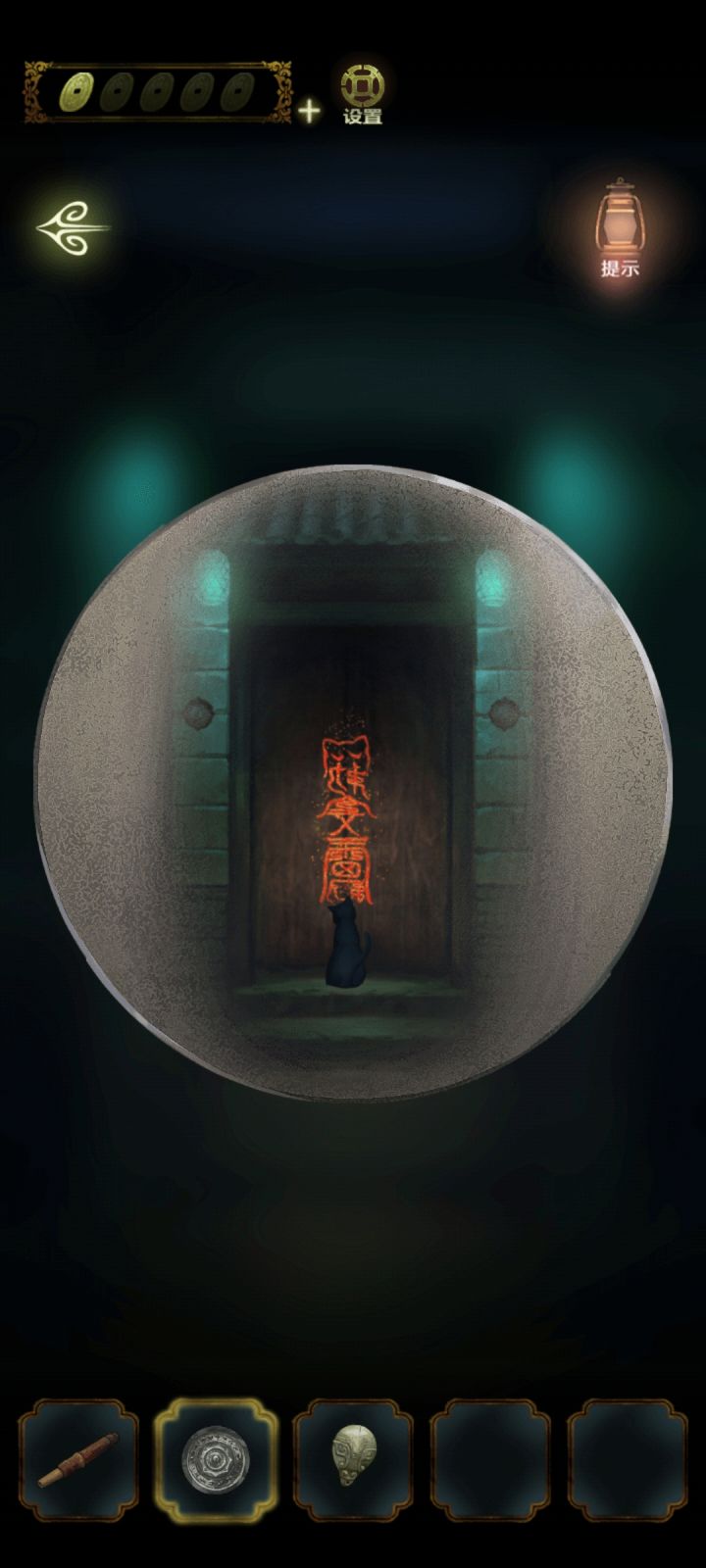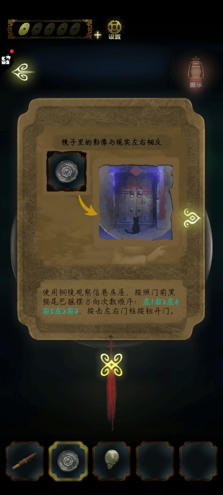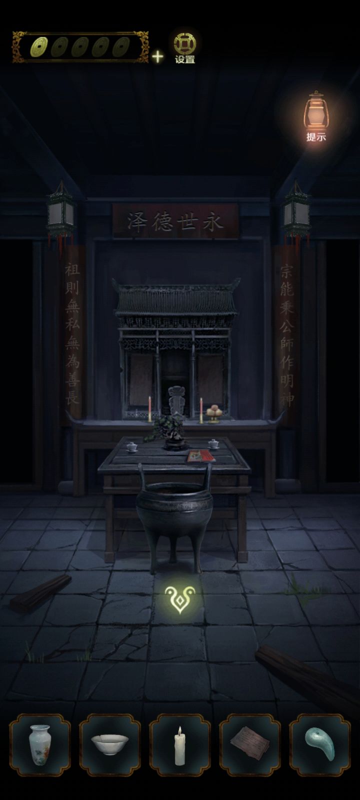 点↙️出来。点⬅️到走廊点帘子观察上的深颜色的部分,要从左往右数。上面的深色纹得出5326。点帘子对面的柜子上的锁输入密码5326开锁。🔓后从柜子的抽屉里点浆糊。点⬇️院子,点屋子进去先点浆糊,再桌上的灶君像碎片先拼好画像,得到点↘️,出去,点➡️厨房点灶台后的墙,贴上画像然后把绒香点燃,点糖瓜,放在有米饭的碗边上。点饭桌上的食盒。密码线索在贴有画像边上只需要观察,可以看