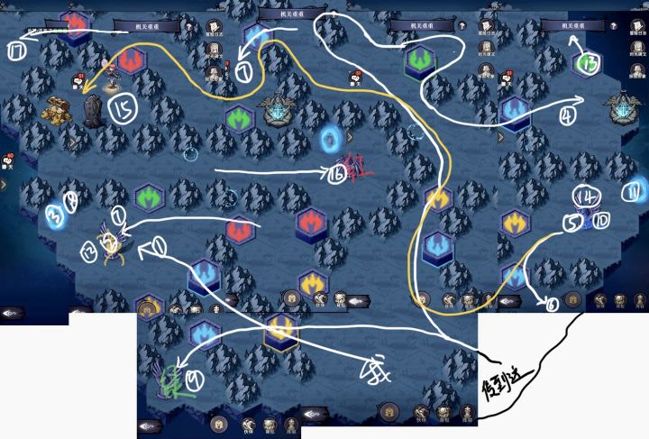 机关重重攻略(不想看想法可直接看图)想法:根据宝箱被阻挡的机关颜色来按开关图片是我拼接的地图,精确到每一步,可供大家参考。