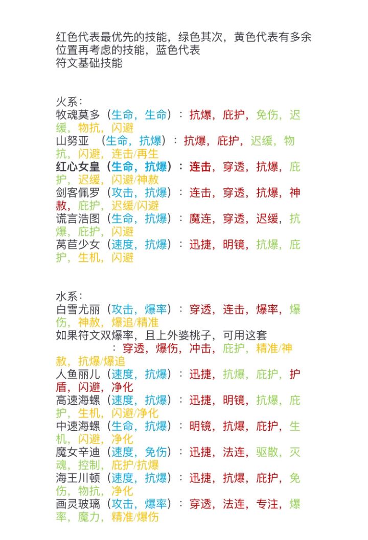 *:这张图不是本人出的,会有略微细差,图片仅供参考,还是文字更重要啦~喷子勿入哦(⁎⁍̴̛ᴗ⁍̴̛⁎)。只会到处乱咬的也就别来了嗷。眼睛🦐的也可以别来。不喜勿入。 (图片仅供参考 重点文字)输出类(法+物):必带穿透 (暴率爆伤等,若暴率足够则下暴率)物理角色带抹杀。连暴流对于大部分时期都适用(法师:迅捷必带,只有温蒂选带)辅助类:有回血的带明镜。魔连只对输出类技能有效果大部分辅助都要