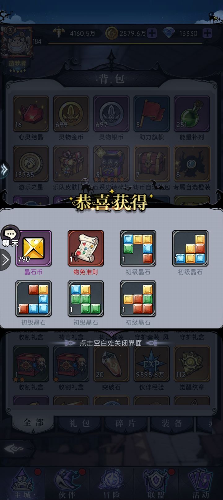 活动时间:2023.5.30-2023.6.5①天降糖果入口:①登录游戏会有弹框;②活动界面左上角;说明:每天的6点-24点可进行,每次游戏限时30秒,收集到的糖果数量会影响最后的奖励;②每日看看说明:签到奖励,当天忘了签到可以补领,领完七天奖励后,点礼盒会给10个棒棒糖;③神奇魔盒说明:盲盒玩法,盒子里概率给魔偶·咒师、高能晶石、棒棒糖、元素精华和符文盲盒,每个魔盒点进去会有三个不