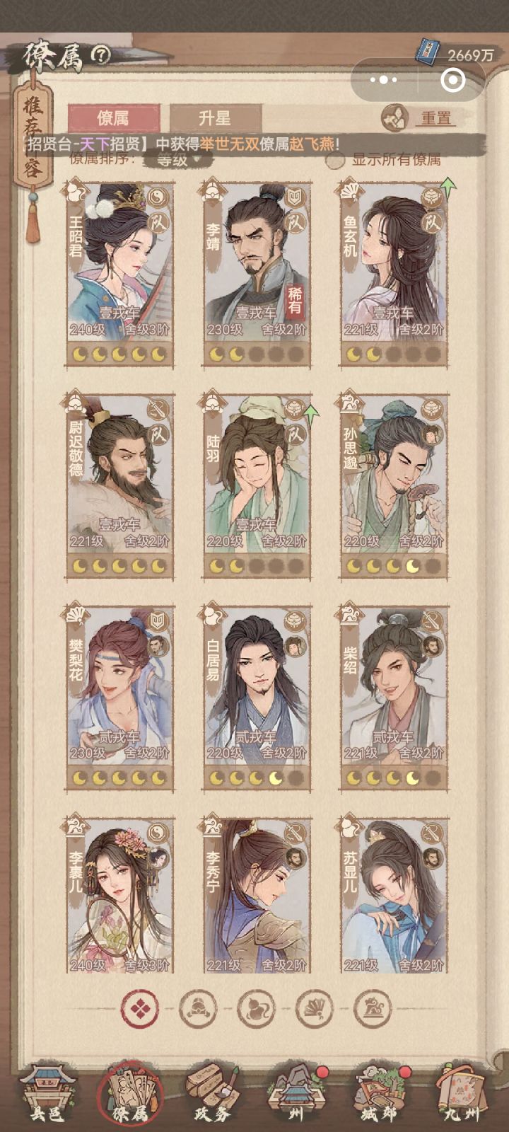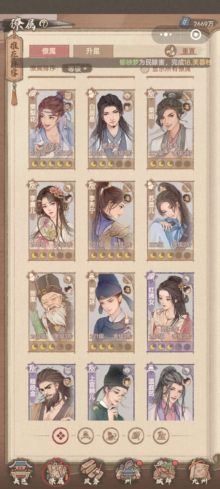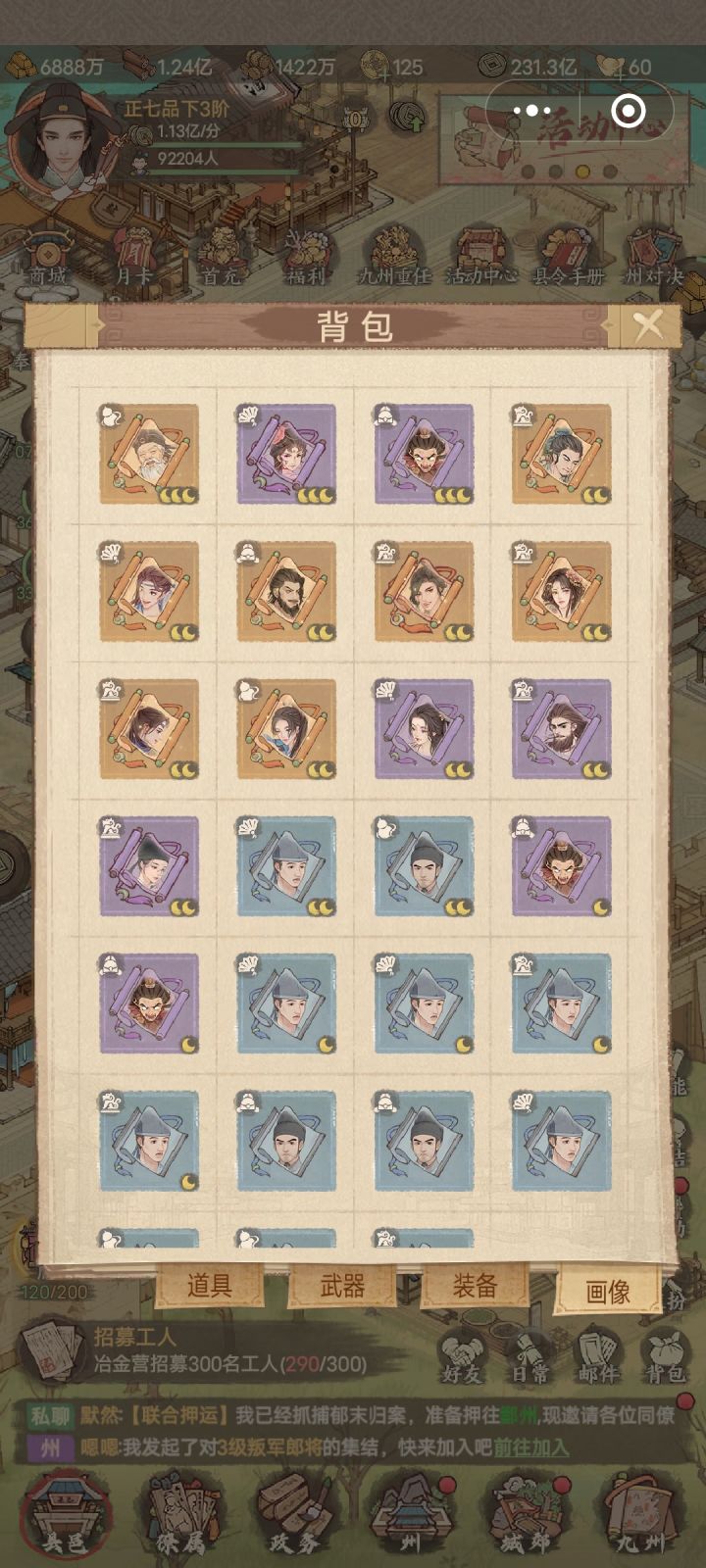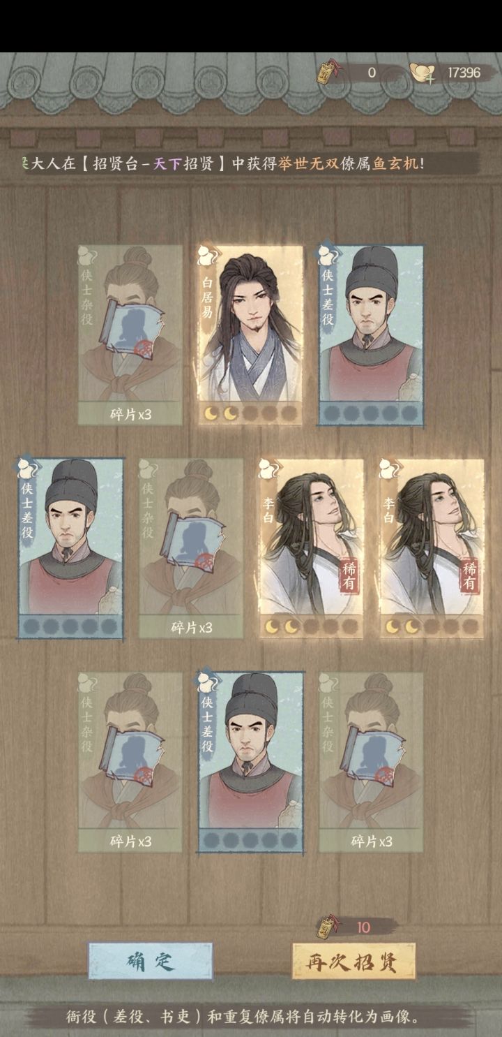 玩了一个多月了,游戏比较氪,不氪体验不蛮好,挨打是常事,抱大腿才是真谛。缺点真不少,就不一一细说了。说点优点,所有东西都是随机,尤其抽卡是真随机,不像原神,阴阳师抽卡气得要死,这个良田的抽卡就是运气不好100抽啥也没有(30抽没用的保底),运气好,一切皆有可能,比如我10连2稀有李白+1白居易也算是非常欧皇炸裂了。游戏比较打发时间,在卡牌游戏的基础上,多了一个主线长安的任务,集采集,占城,策略于一