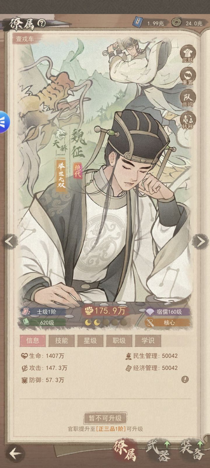 魏征作为游戏中首位双技能组绝代僚属,可自由切换侠士/名士两种形态,定位为主C,兼具高爆发、控场与隐身生存能力,适配多套主流阵容,是从平民到高氪玩家都值得重点培养的核心输出。一、核心定位与养成核心核心定位:双形态主C(侠士形态侧重爆发收割、刺客切入;名士形态侧重持续AOE输出、续航抗控),核心优势是“隐身保命+高倍率输出+控场干扰”,6星为质变节点,解锁隐身与免死机制后,生存与输出能力大幅提升,