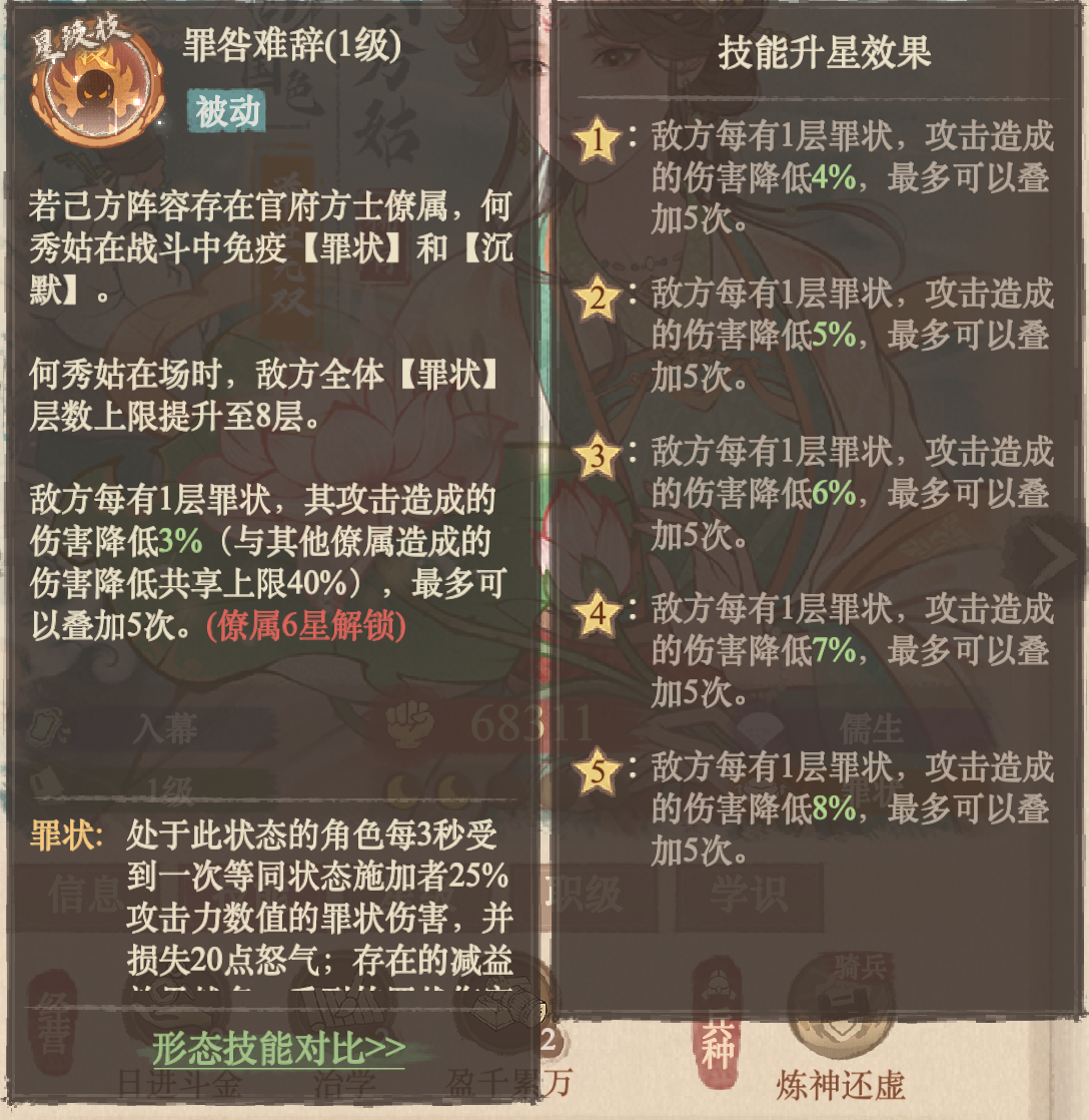 基于官府何秀姑以“罪状”为核心的控场与持续作战特性,可以构建出一套强度可观的“官府罪状沉默队”。该阵容旨在通过高频的罪状叠加与沉默控制,逐步压制并击垮对手。阵容构成:长孙无垢(官府)、李一桐、何秀姑(官府)、李善德、林动核心逻辑与角色分工:此阵容的核心在于形成“罪状叠加-沉默控场-团队续航”的战斗闭环。长孙无垢作为官府形态的核心输出,其技能与罪状机制有深度联动,何秀姑的罪状翻倍效果能让她迅速达到