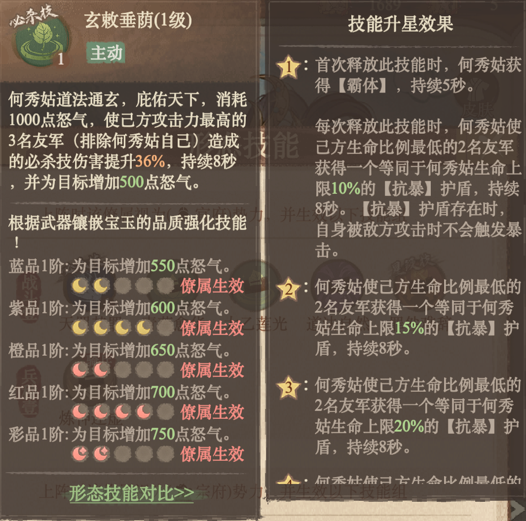 荷韵仙姿·何秀姑作为新登场的国色稀有药师,当切换至宗府形态,何秀姑便从一位控场大师转变为顶级的爆发辅助与战术防御核心。此形态下的她,技能机制围绕怒气辅助、伤害增益与针对性反制展开,能极大提升队伍的爆发上限与生存能力。宗府形态的必杀技“玄敕垂荫”堪称团队发动机。该技能可以提升三名攻击最高友军的必杀技伤害,并为其回复大量怒气,首次释放时自身还获得【霸体】效果,确保技能链不被中断。此外,每次释放还会为生