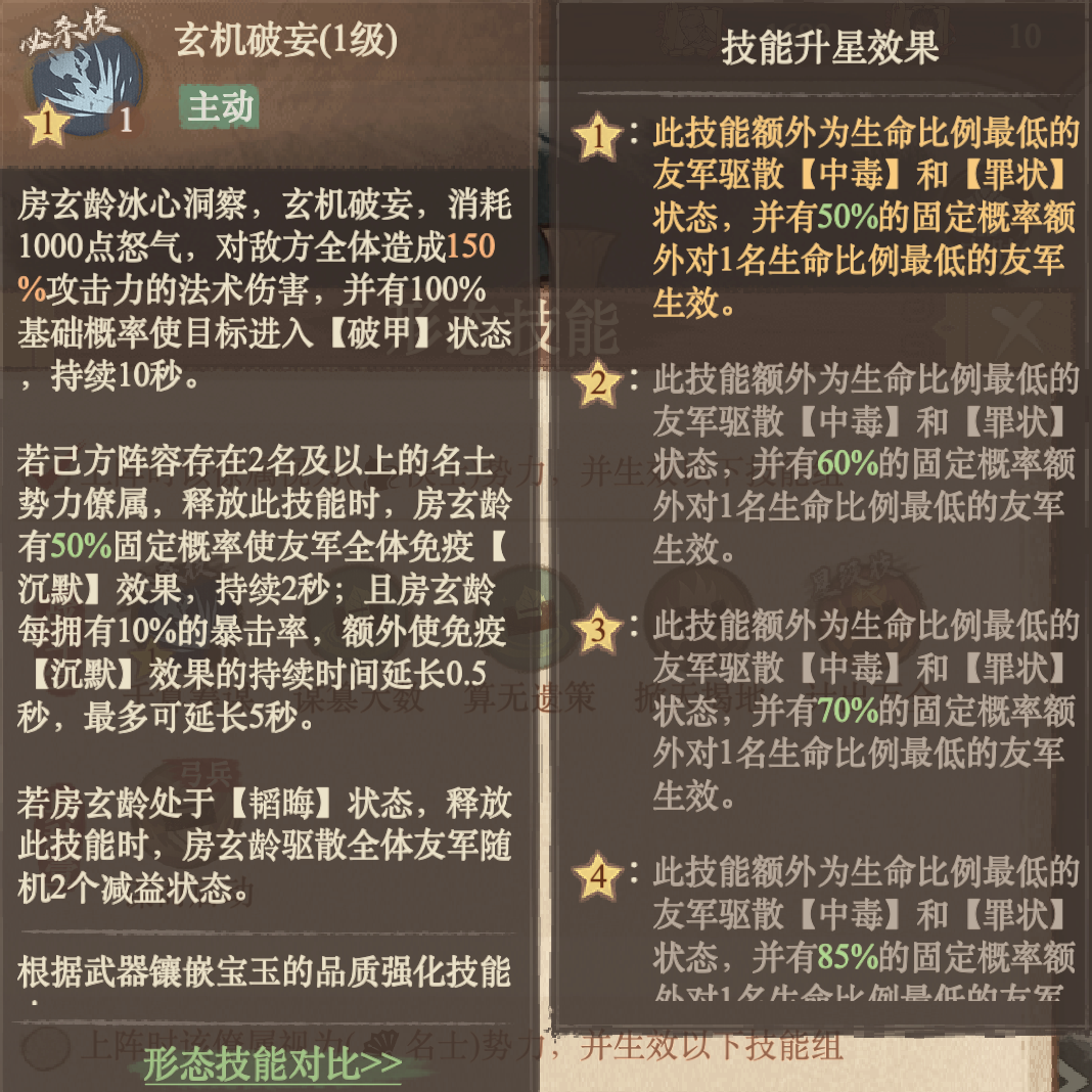 盛世谋臣·房玄龄作为新登场的天骄稀有药师,当切换至名士形态,房玄龄则展现出其作为谋臣的沉稳与韬略,技能组偏向于生存辅助、团队驱散与持续增益,能有效提升队伍的整体韧性与持久作战能力。名士形态的必杀技“玄机破妄”是一个强力的战术技能。它能对敌方全体造成法术伤害并附加【破甲】效果,使敌人更易受到伤害。释放时,房玄龄有概率免疫沉默,保障自身技能顺畅释放。当处于“韬晦”状态下,该技能还能为全体友军驱散两个随
