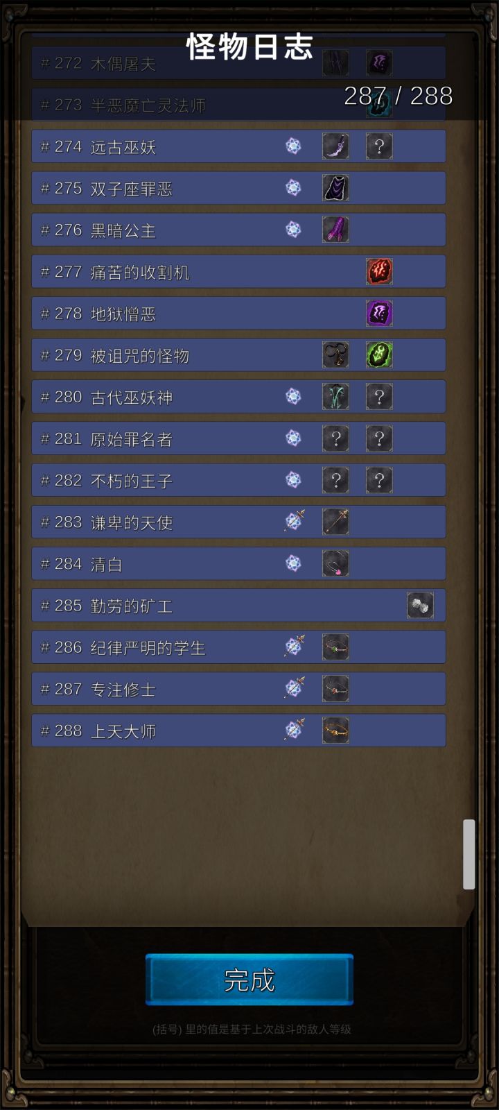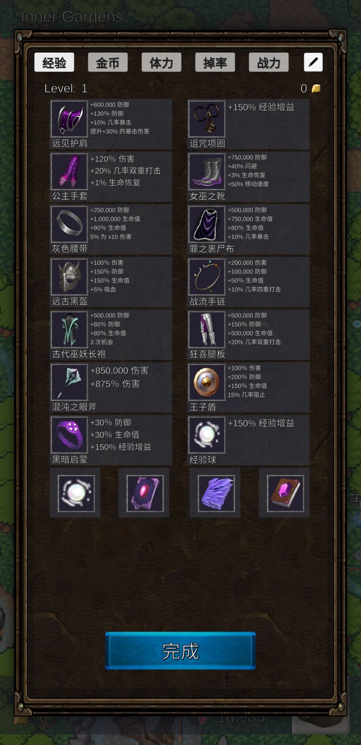 还有两个需要特殊装备的怪(需要爆出75w级BOSS的竖琴)推图普通装备用属性最高的就行,特殊装备用三本经验书加上一本战争之书一本暗影之书。加点血、力、体、敏、运各一点(不加敏捷打不中怪,不加幸运可能十几次boss都爆不出装备)。后面带上五本加基础属性的书去找95w级的怪,会出来一个100w级的怪,然后打赢100w级的怪会出一个五书合一的终极之书(用来替换战争之书),155w的女巫组长会爆加4