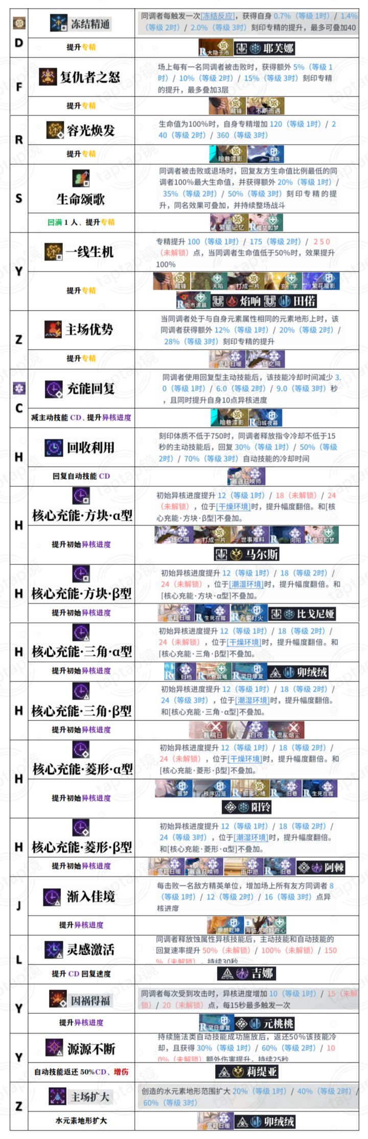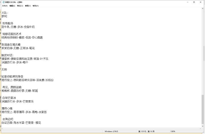 因为测试时间有限,加上我没有抽到全部角色。只列出我知道的茶息,希望大家公测可以用上。欢迎评论区补充。水属性: 龙晴 层次感双莓之恋-双倍糖-热-蜜桃冻 牛≠豹富甜牛乳-正常糖-常温-燕麦奶瓦卡莎咖啡奶油奶油芭蕾-脱脂牛奶-正常-低因随便配配 茉莉奶绿-五分糖-正常冰-椰果枸杞的平方双层叶纹-枸杞菊花茶-枸杞 梅干搭档 薄荷蜜柚苏打-正常冰-咸梅干芙蕖健康管理青叶