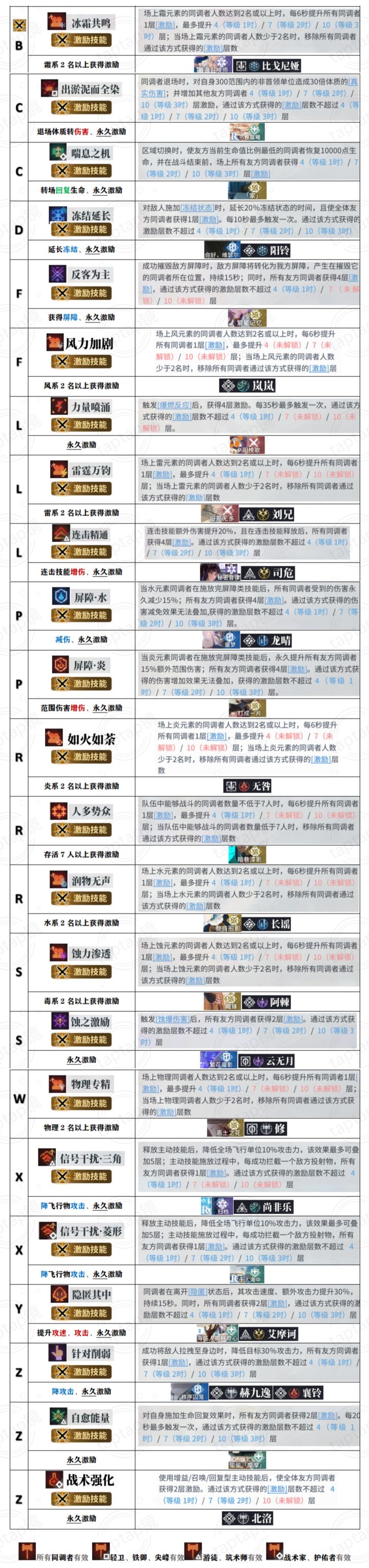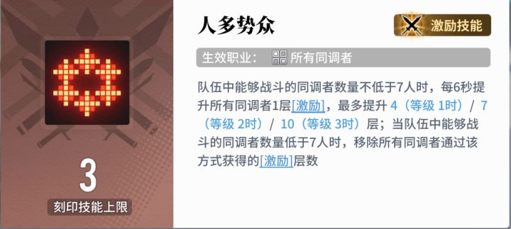 一、激励:激励是一个通用的伤害提升buff,假设你的面板伤害是100,那么一层激励之后你打出去就是100X(1+10%)=110的伤害,激励上限20层,即能获得200%的伤害提升激励的条件分为2种:1是以暗巷等为代表的,当要求不满足之后,会掉激励层数。比如暗巷需要队伍中活着7个,如果你死多了,获得的激励层数就会掉2是以噩梦等为代表的,满足要求后激励层数永久存在,例如龙晴放完盾激励加上了,哪