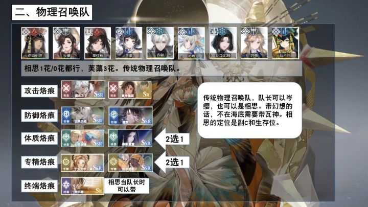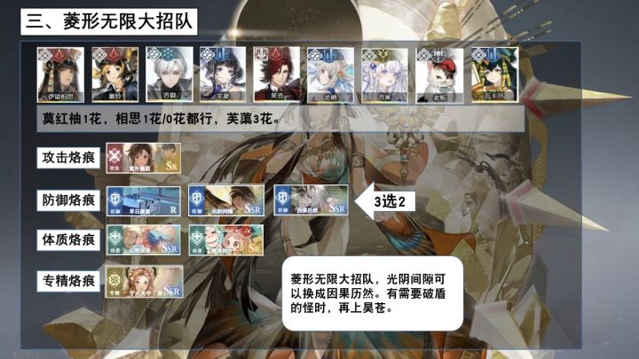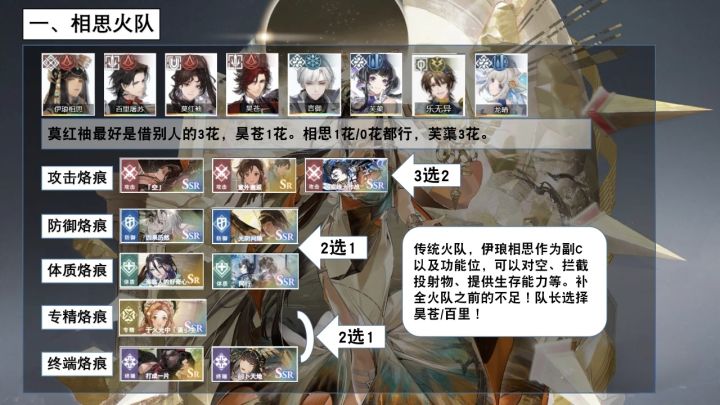 本篇内容包含:一、伊琅相思的抽取建议二、成型易的方块火队三、岑缨喝汤的菱形物理队四、菱形火/其他菱形反应五、更多攻略合集一、伊琅相思的抽取建议普通极慢 0.13次每秒 主要靠被动打伤害/打控制/减火抗方块火队 0花抽取>烙痕不抽菱形物理队 烙痕光阴间隙>0花>1花菱形火队 烙痕光阴间隙>1花>3花二、成型易的方块火队一句话总结:屠苏做队长 伊琅相思替换莫红袖 其他不变(