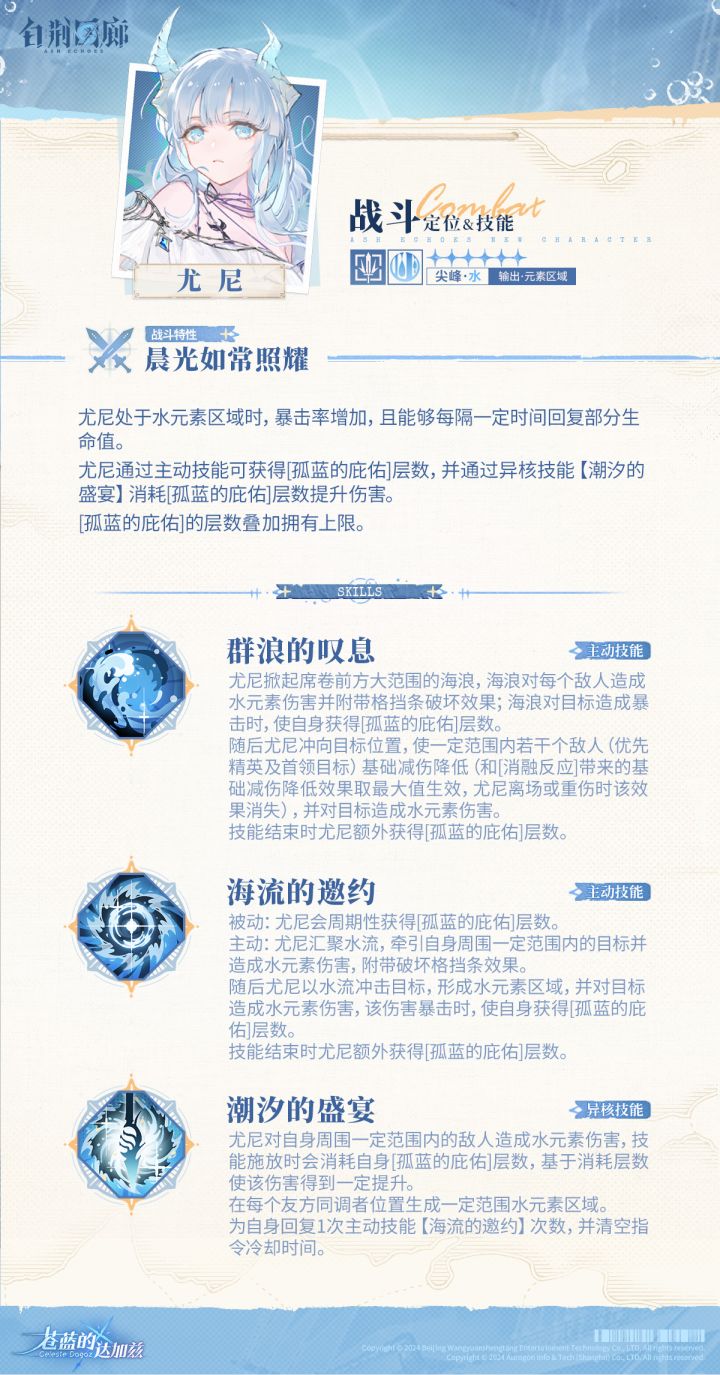重要重要很重要宣布:卯卯和绒绒彻底,彻彻底底沦为下水道绒绒:姐姐,我们没人要了卯卯:没事,这不是还有紫都姐姐吗?——————————————————————之前的猜测完美应验,尤尼和水元素区域绑定,技能和特性都和水元素区域有关。还没看尤尼技能爆料的这里说一下,因为没有技能具体数值,这里只谈技能机制。首先是尤尼的战斗特性。尤尼处于「水元素区域」时,增加自身暴击率,并且恢复自身生命值。