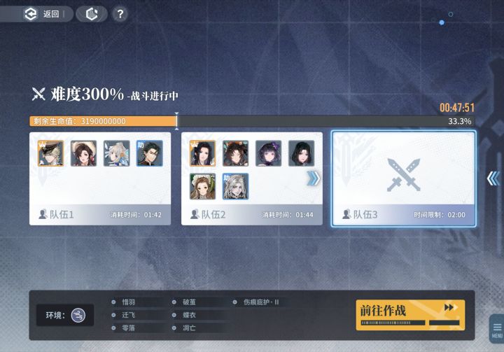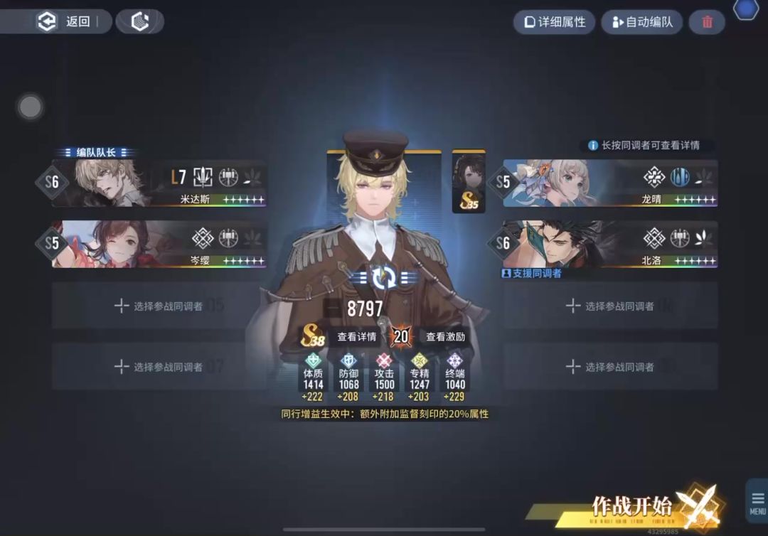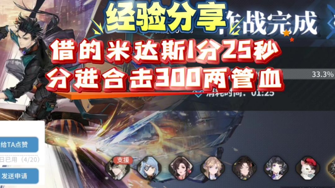简要提示注意: 1. 开局:北洛快递送到boss身上,岑缨飞机施放位置看灵偶锁定同调者方向,龙晴开水屏障保护。 2. 米达斯爆发前,开一次龙晴一技能,清负面buff。 建议:出现分身+米达斯大招冷却好,此时开终端增益。米达斯调整角度,一波带走三个分身,随后两次恐惧直接打到boss身上,血条消失目标达成! 3.【重点】出现飞蝶,需要留好岑缨大招 或者 北洛一技能,至少拦截两次飞蝶。 完整攻略参考:h