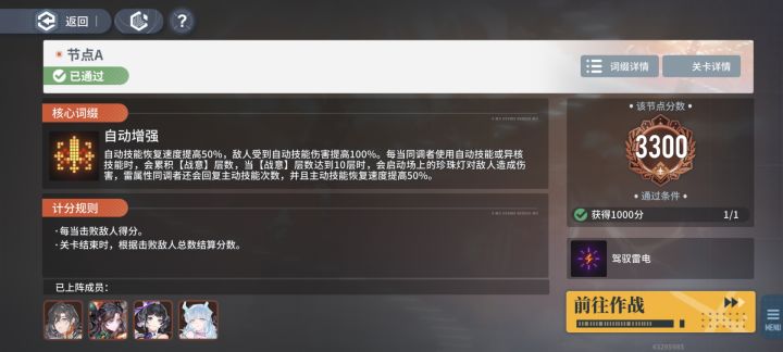 一、A节点-言雀1.机制分析(以03节点为例)(1)伤害计算:以击败敌人得分。(2)地图是:空想王国,海底。自带水环境,方便触发水雷传导反应。首选:雷元素队。自选增益配合:选驾驭雷电。(3)两种配队思路:一是雷三角,带渐入佳境,场上小怪多,可以达到无限大招输出效果,打得慢一点。二是水雷方块,带朗朗,麻痹大意触发易伤,伤害高,输出快。(4)腐朽,敌人刚上场的减伤buff,对操作没