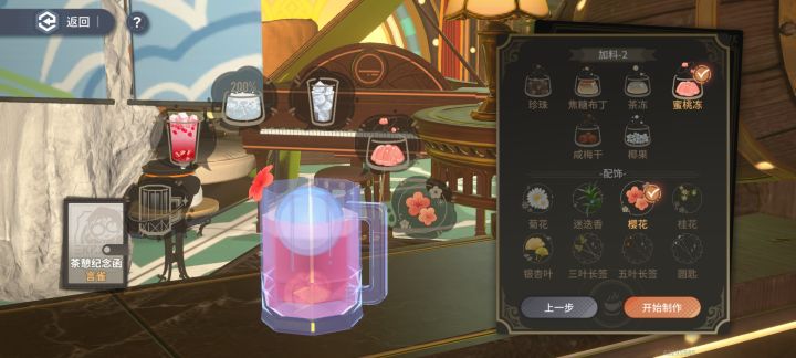 更新到10级。默契值:杯子和配饰都随意。 休息室舒适度:7005。 p2-6级-双莓之恋,双倍糖,多冰,蜜桃冻。605p3-10级-白桃芝士奶盖,双倍糖,多冰,青提。660话说妹妹喜欢小料的语音有小公主的感觉!虽然有点欠~纪念函: 初次见面-扎啤杯,姜茶,无糖,热,枫叶。 159认生-航海时代,枸杞菊花茶,黄瓜片,茶冻,水果签。324怀念-马克杯,熊熊燕麦牛奶,全脂牛奶,旺旺饼干