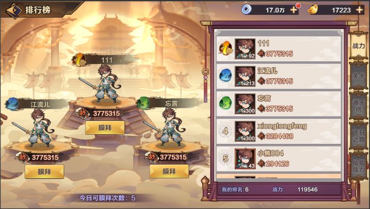 排行榜玩家可以在排行榜内查看各种分类的排行榜内的玩家信息,并且可以对排行榜内玩家进行膜拜,获得奖励。膜拜有每天上限次数