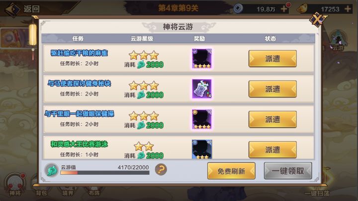 云游玩家在出战中会获得云游值,玩家可以通过消耗云游值,在云游界面内,选择任务进行完成。完成任务需要达成任务条件,在完成后,可以领取奖励。