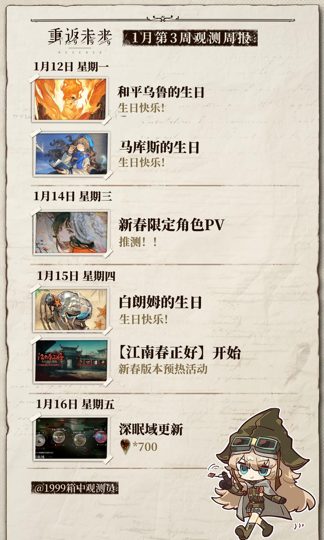 任何时间,任何地点,超级观测员,认真办周报!本周重返未来1999的活动提醒来了~司辰宝宝们记得点赞收藏,不要错过活动上新噢!周一和平乌鲁生日马库斯生日周三新春限定角色PV(推测)周四白朗姆生日预热活动【江南春正好——东方游记特辑】开始周五深眠域更新我是带来最前线播报的观测员,内容制作不易,求司辰们点点关注~追更不迷路!祝关注的司辰们本周抽卡十连出双金,我们下周一观测周报再